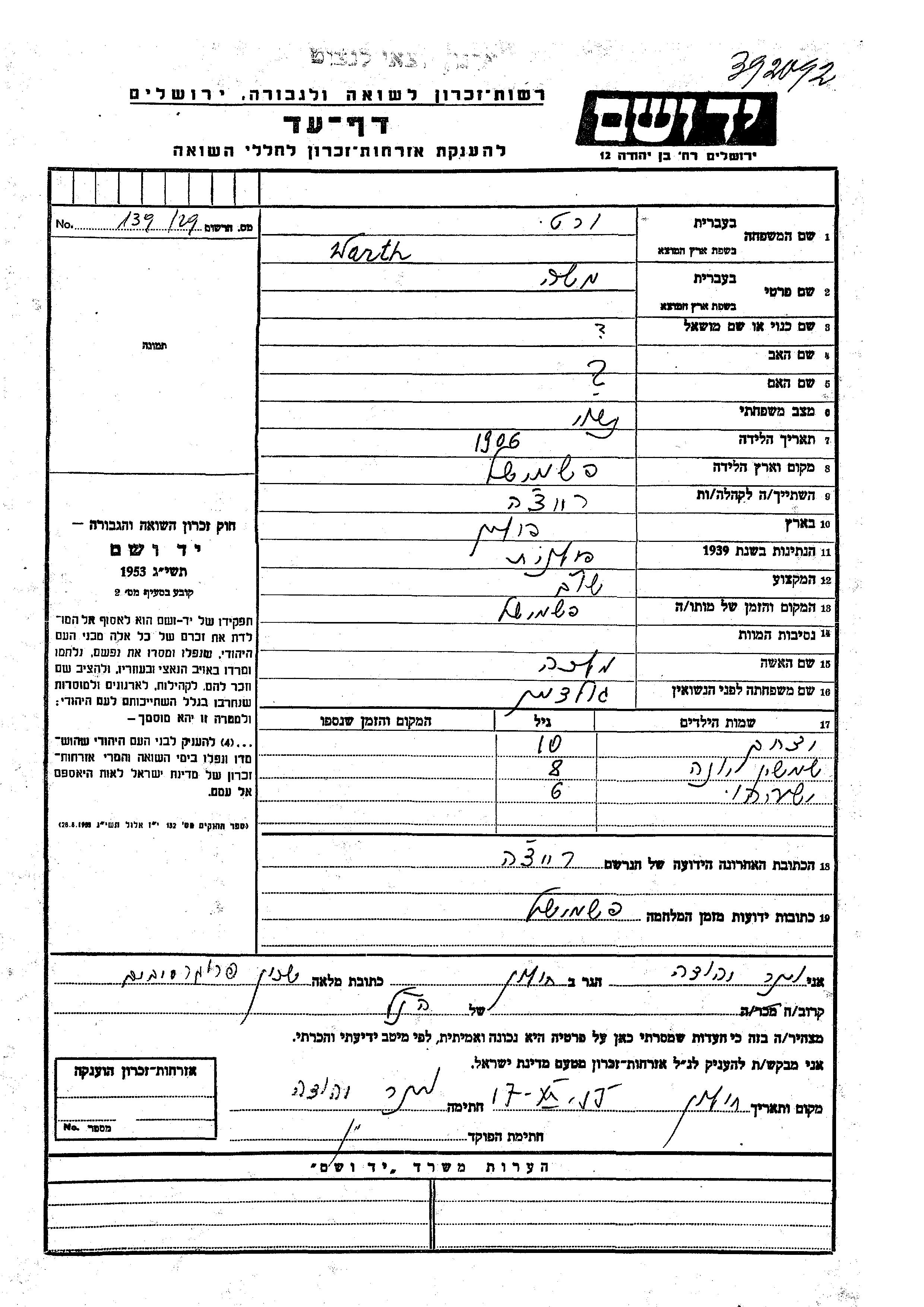 עיר/כפר, גטו/מחנה או אתר רצח או מחוז/אזור או מדינה. שם מקום ניתן לחפש רק בא-ב לטיני.