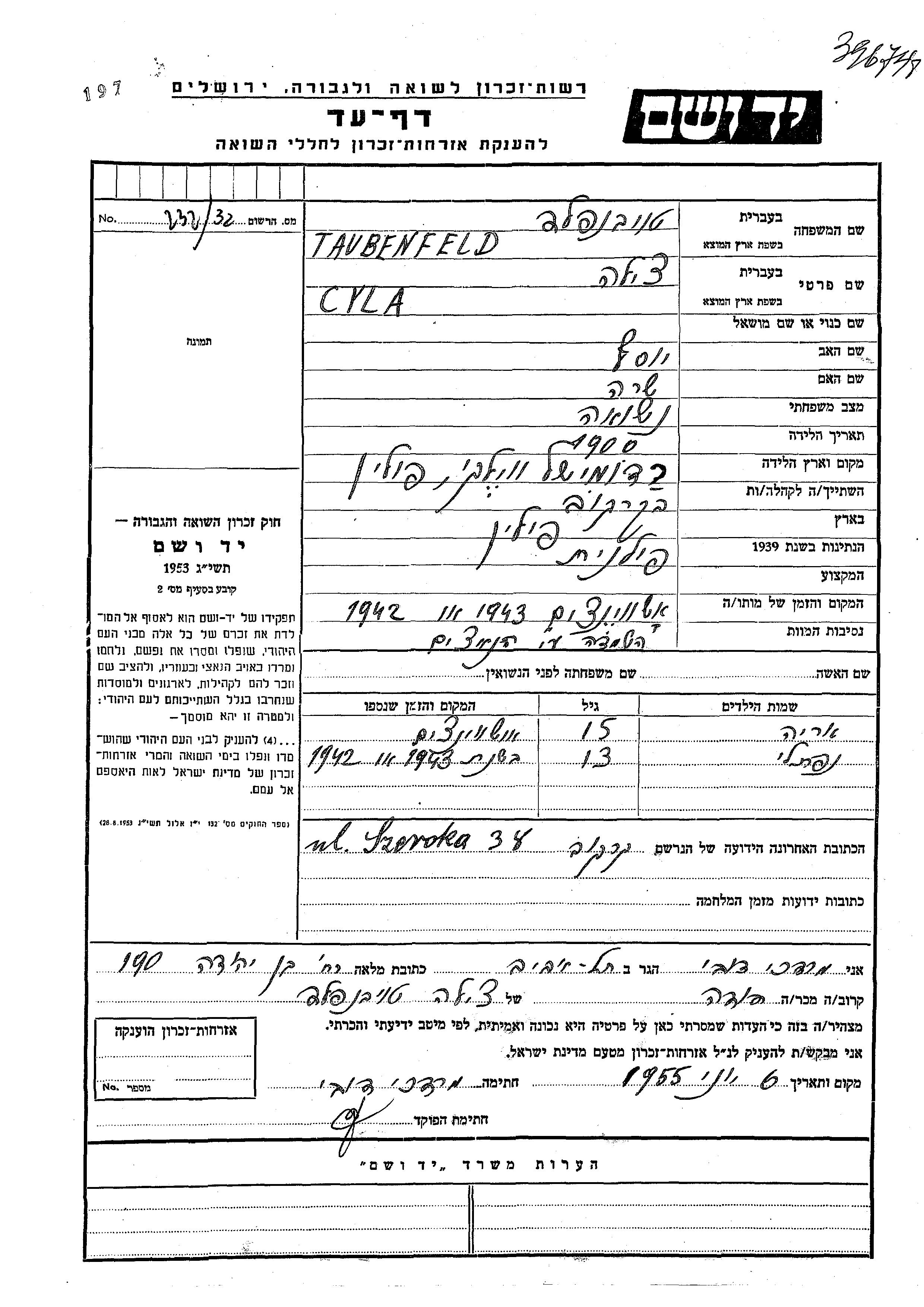 Cyla טאובנפלד טויבנפלד נולדה בRadomysl Wielki שבפולין בשנת 1900 ליוסף ושרה. היא היתה נשואה. לפני מלחמת העולם השניה התגוררה במקום לא רשום. היא נרצחה בשואה. מקום המוות: Auschwitz שבפולין בשנת 1942.