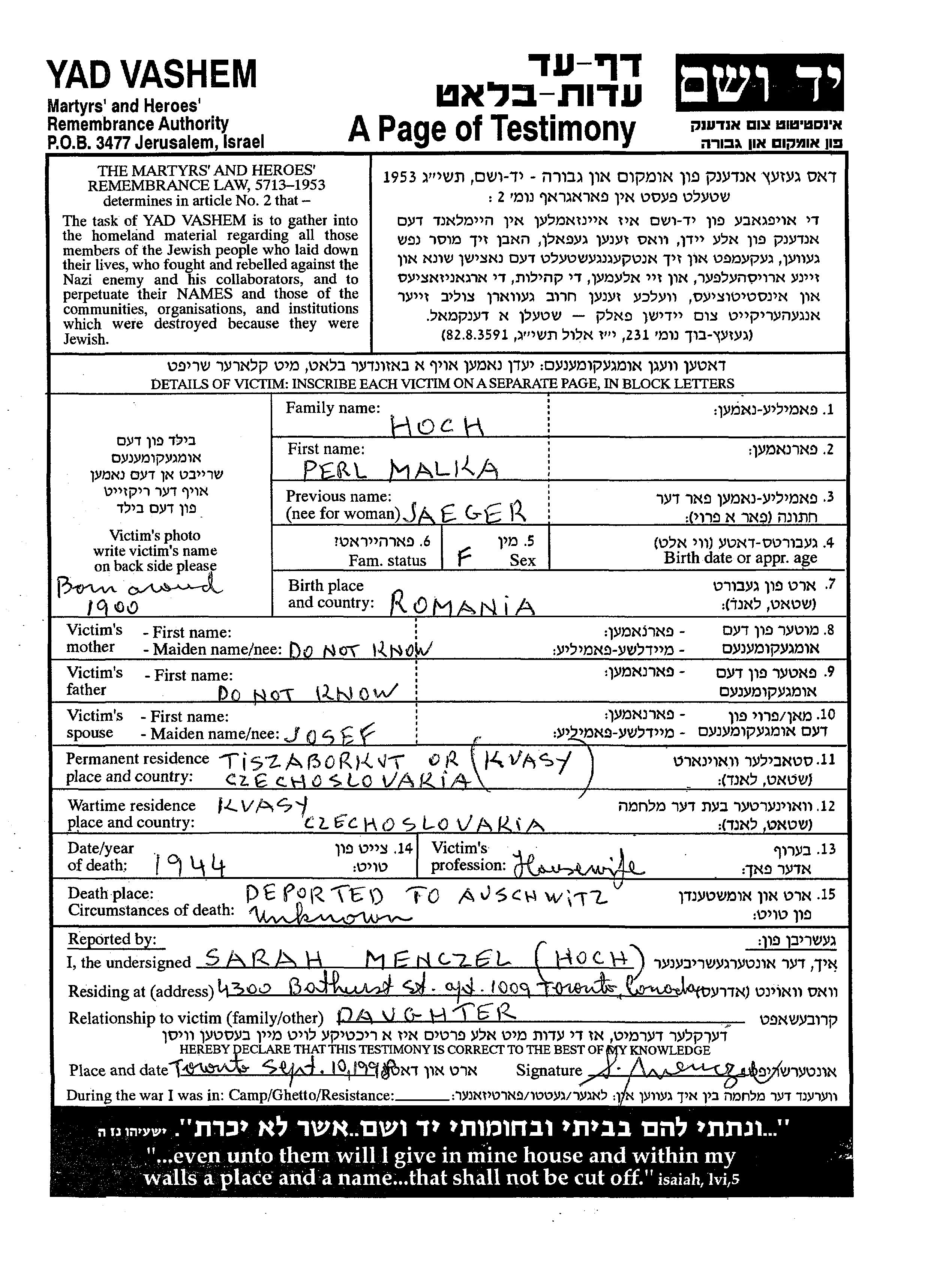 Perl מלכה Hoch לבית Jaeger נולדה ברומניה בשנת 1900. היא היתה עקרת בית ונשואה לJosef. לפני מלחמת העולם השניה התגוררה בTiszaborkut שבצ'כוסלובקיה. בזמן המלחמה היא היתה בKvasy שבצ'כוסלובקיה.
