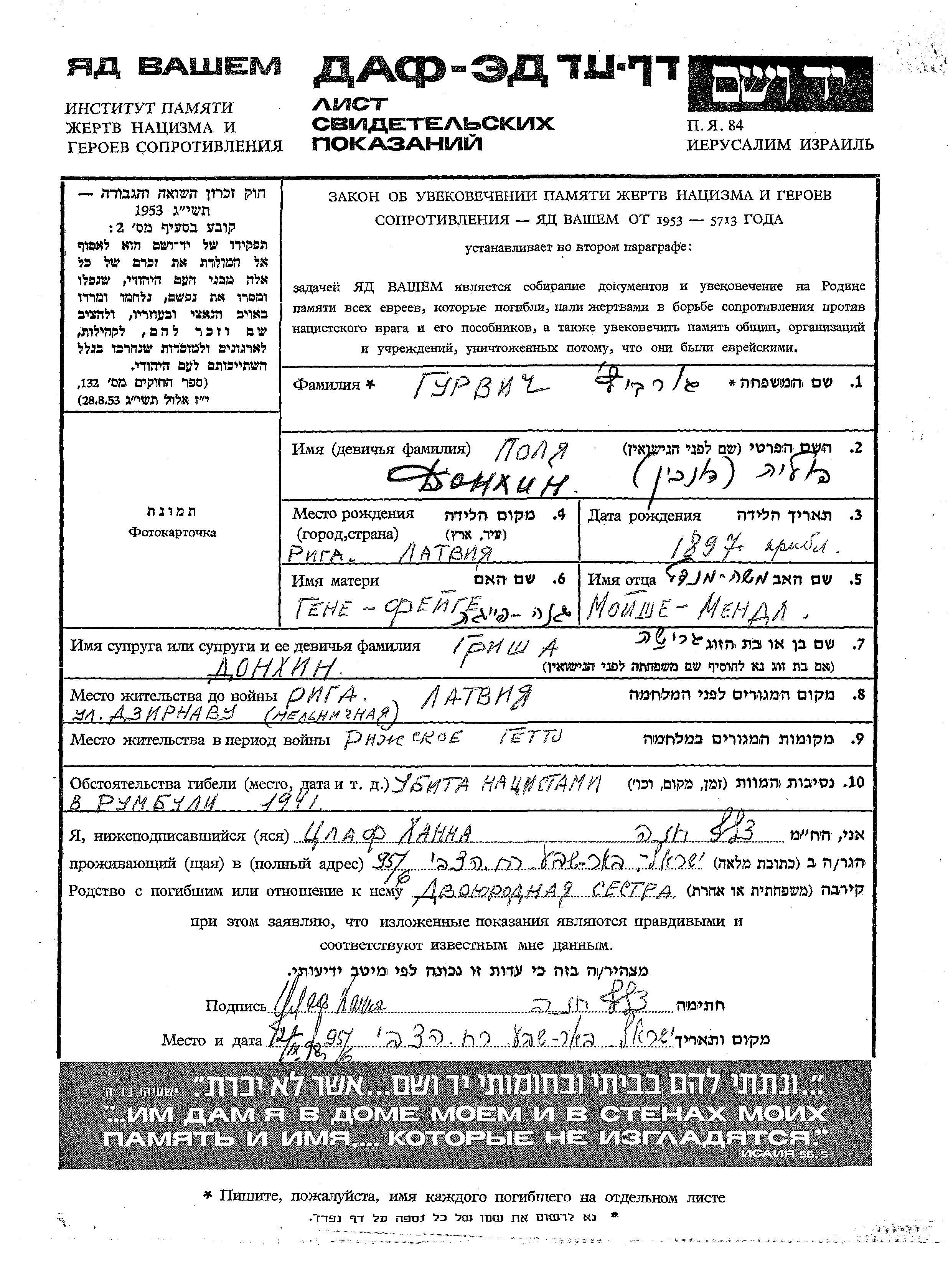 היא נרצחה בשואה. מקום המוות: Rumbuli שבלטביה בשנת 1941.