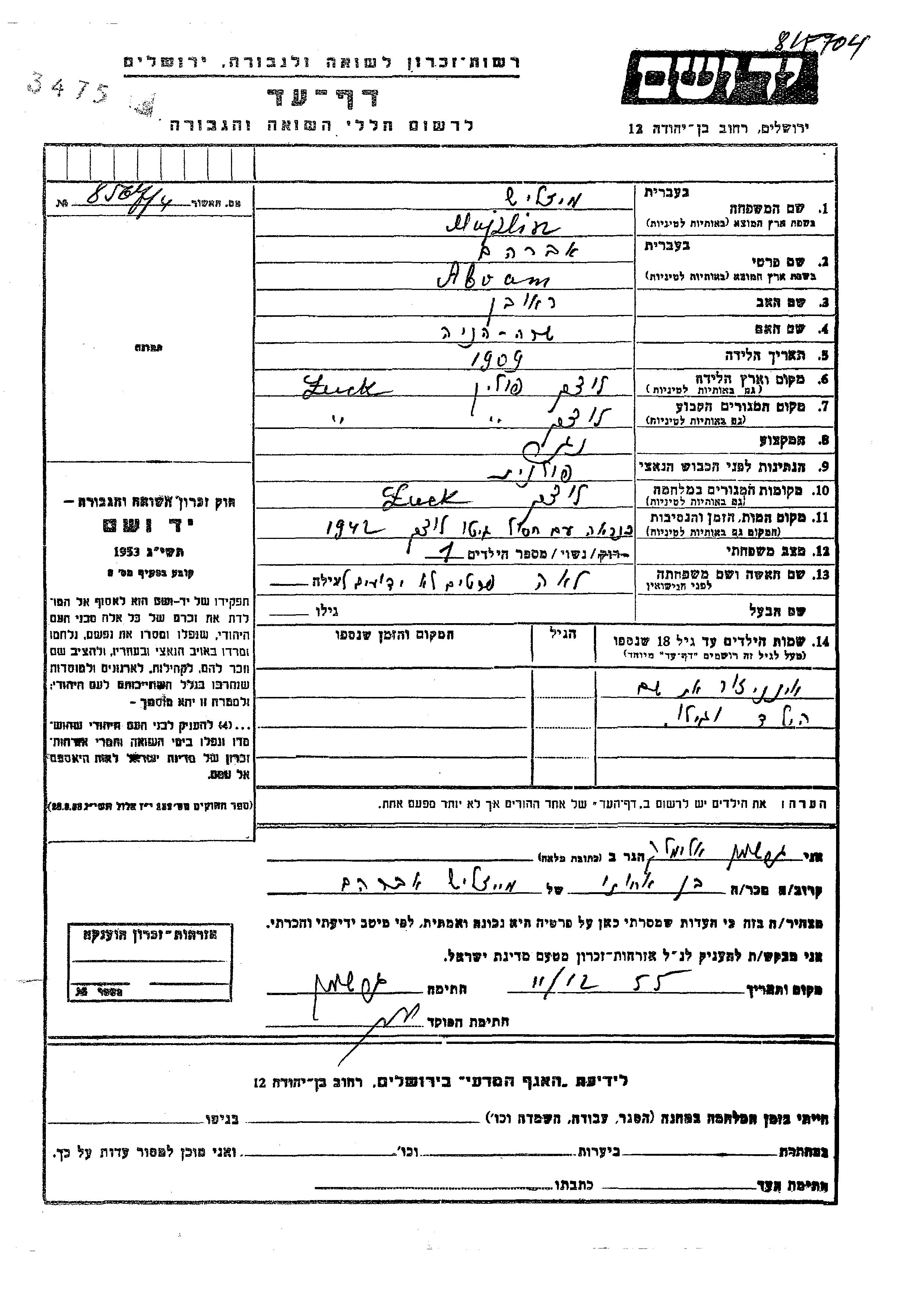 אברם נרצח בשואה. מקום המוות: Luck שבפולין בשנת 1942.