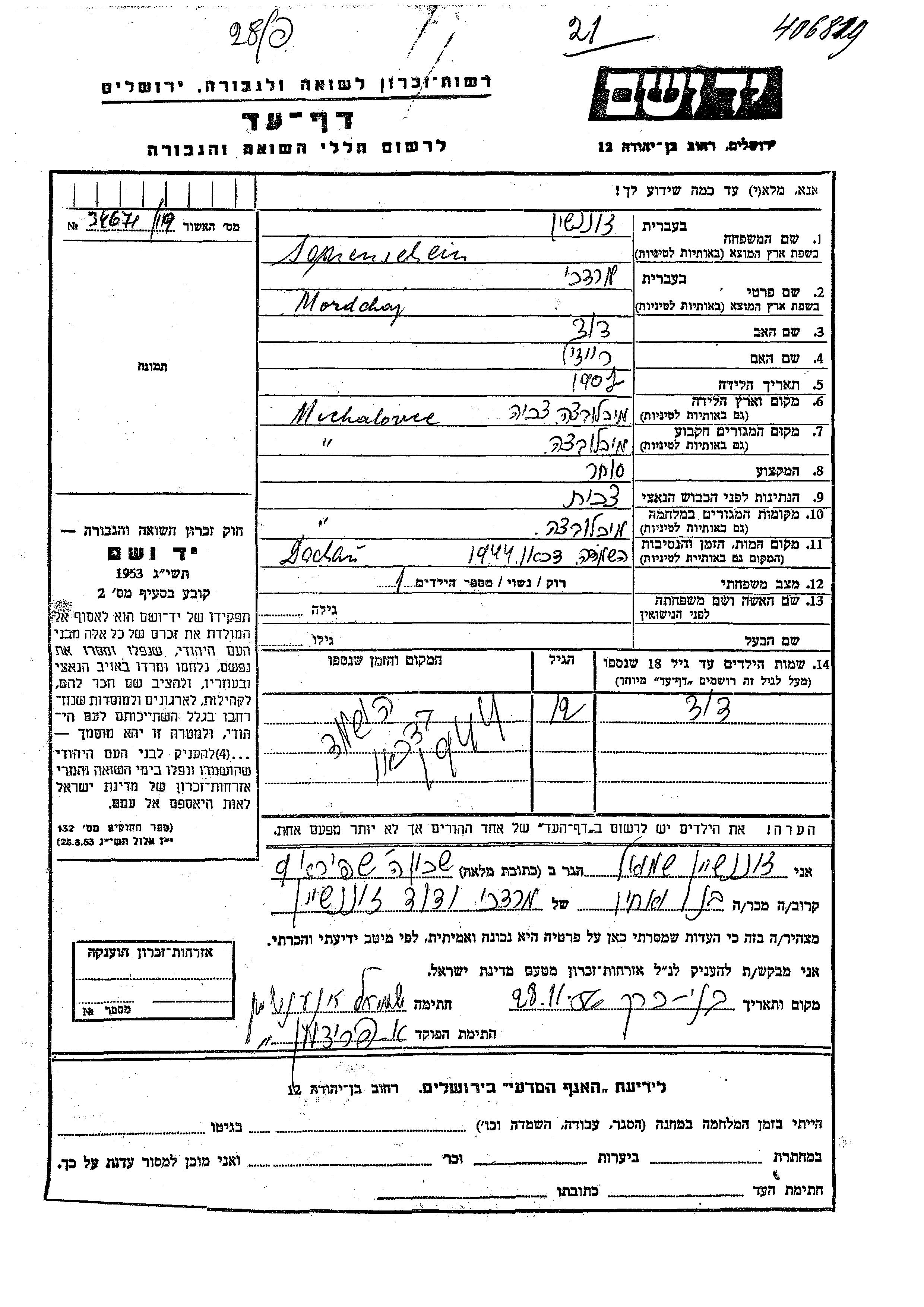 דוד Sonnenschein נולד לMordchaj. הוא היה ילד. לפני מלחמת העולם השניה התגורר בMichalovce שבצ'כוסלובקיה. בזמן המלחמה הוא היה בMichalovce שבצ'כוסלובקיה. דוד נרצח בשואה.