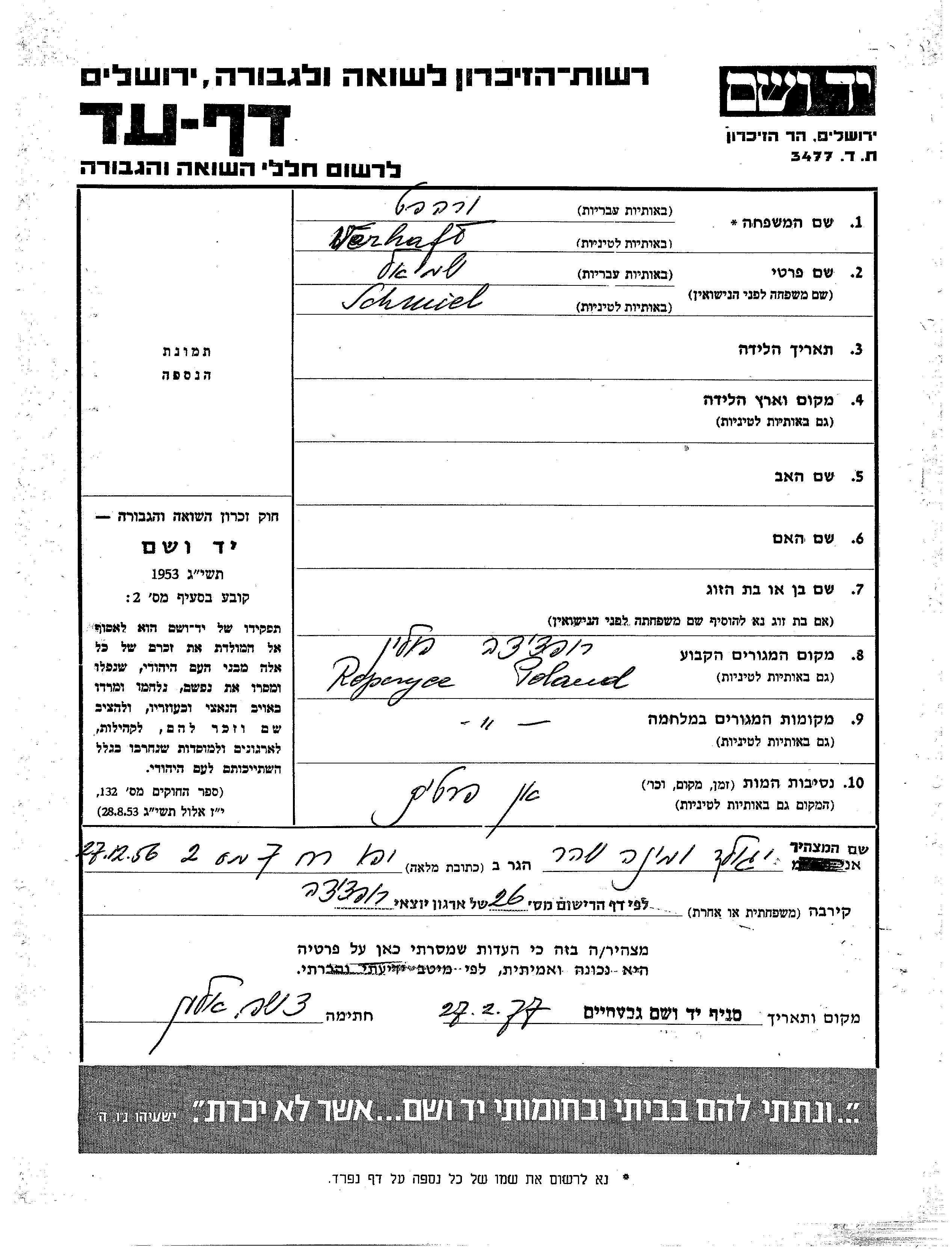 Shamuel ורהפט. לפני מלחמת העולם השניה התגורר בRopczyce שבפולין. בזמן המלחמה הוא היה בRopczyce שבפולין.