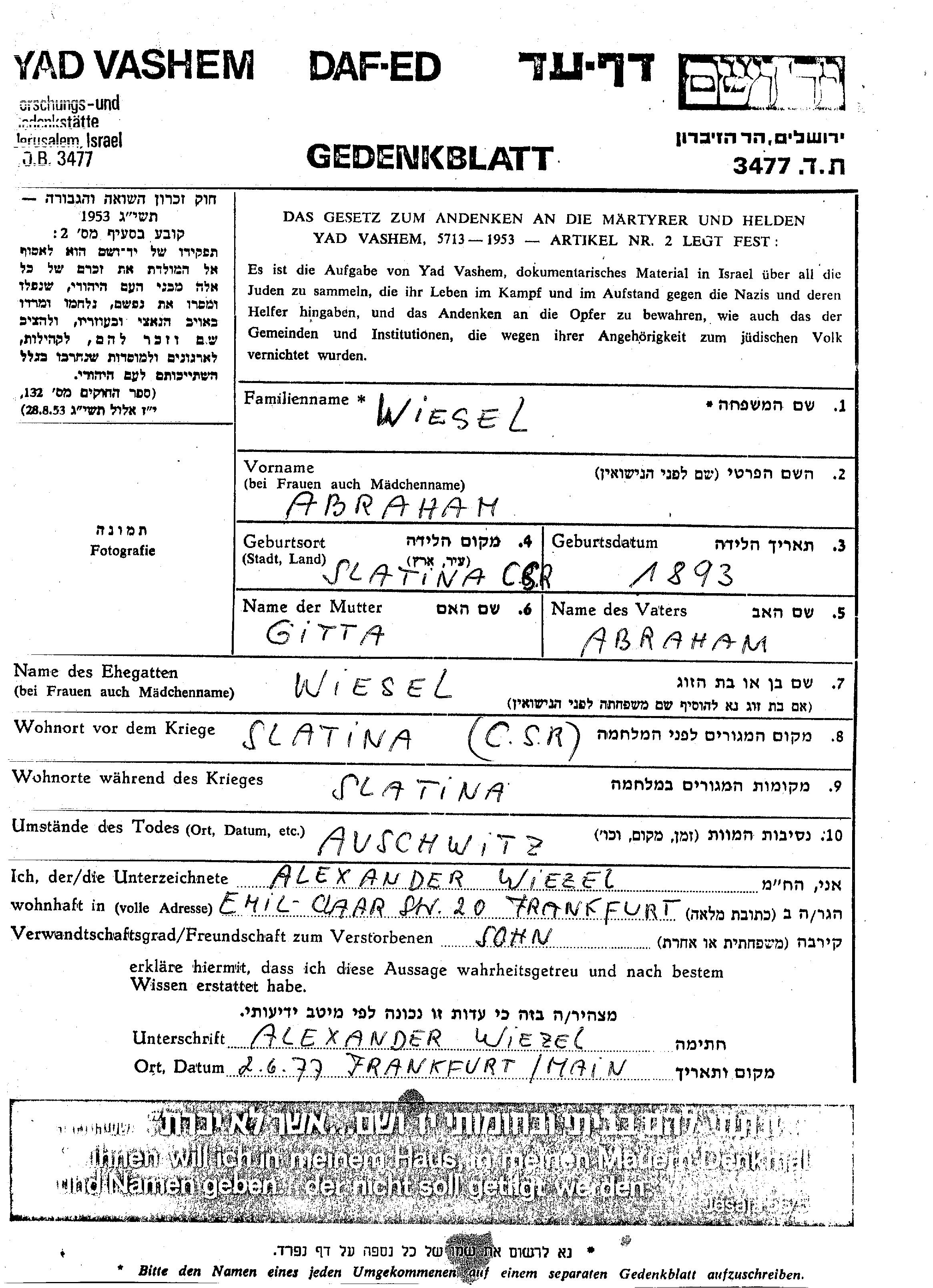 Abraham Wiesel נולד בSlatina בשנת 1893 לAbraham וGitta. לפני מלחמת העולם השניה התגורר בSlatina. בזמן המלחמה הוא היה בSlatina.