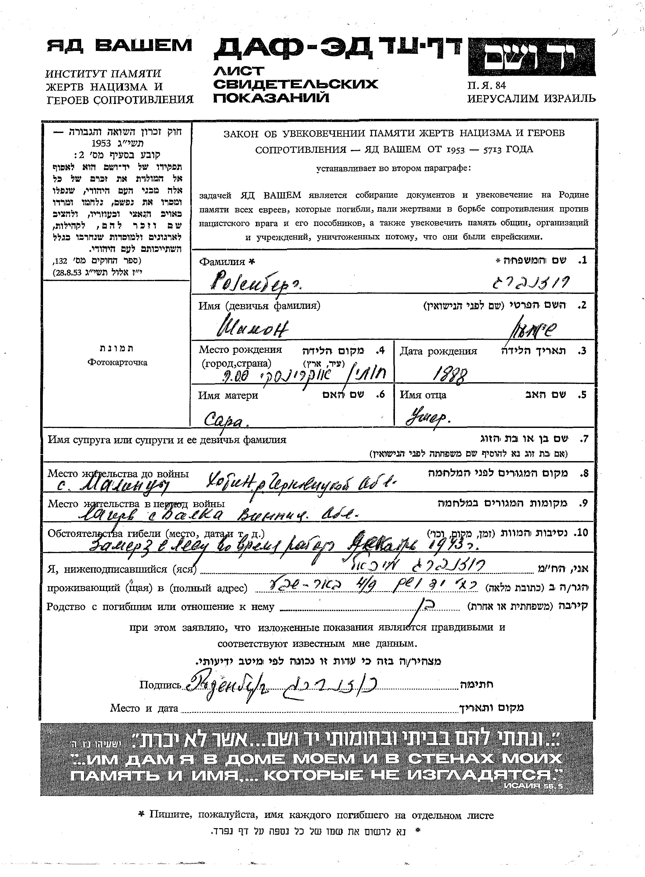 שימעון רוזנברג נולד בHotin שברומניה בשנת 1888 לאושר ושרה. הוא היה נשוי. לפני מלחמת העולם השניה התגורר בMalintsy שברומניה. בזמן המלחמה הוא היה בBalka שבאוקראינה (ברה"מ). שימעון נרצח בשואה. מקום המוות: לא ידוע בשנת 1943.