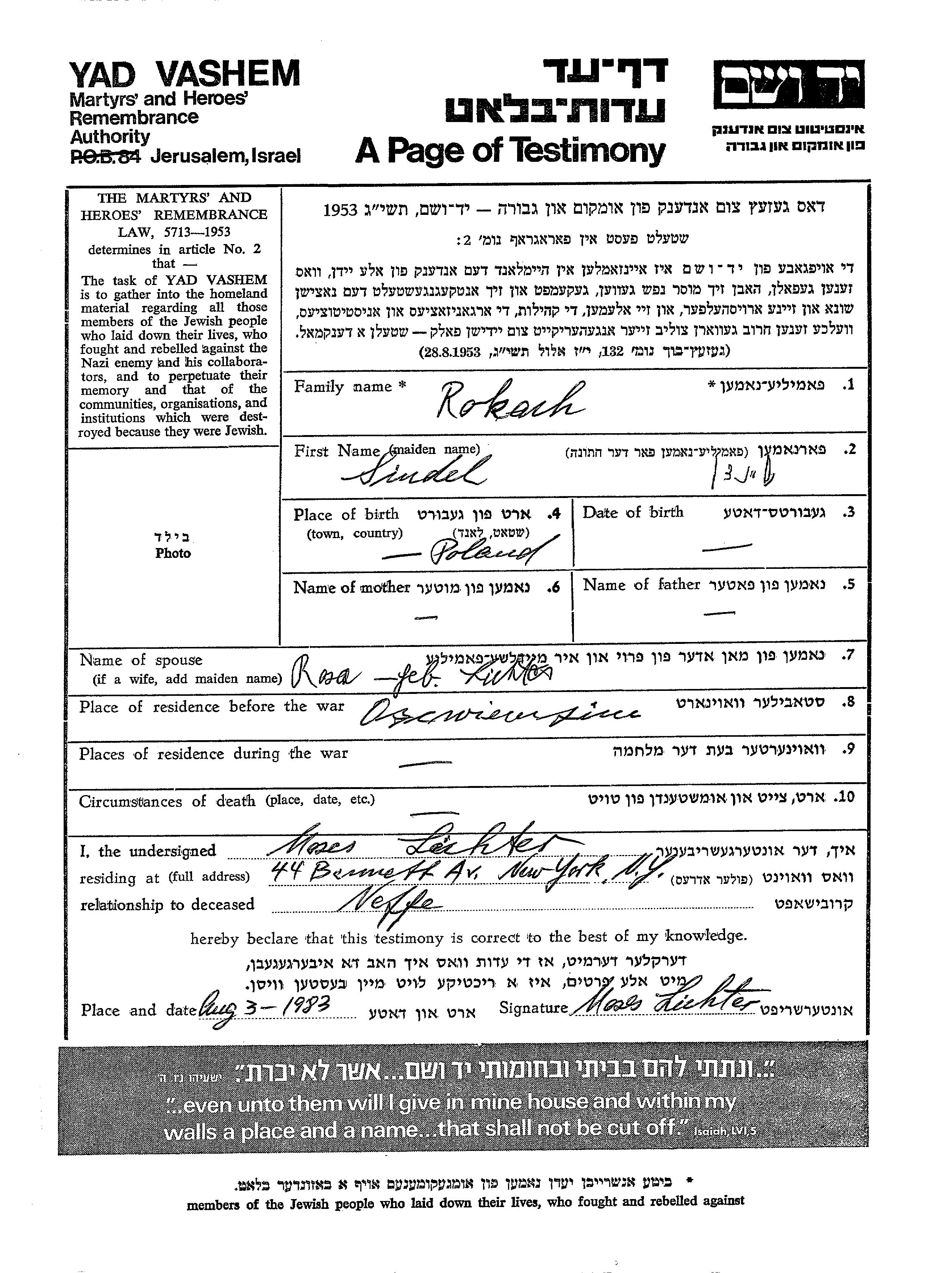 Sindel Rokach נולד בפולין. הוא היה נשוי לRosa לבית Lichter. לפני מלחמת העולם השניה התגורר בOświęcim שבפולין. בזמן המלחמה הוא היה בOświęcim שבפולין.