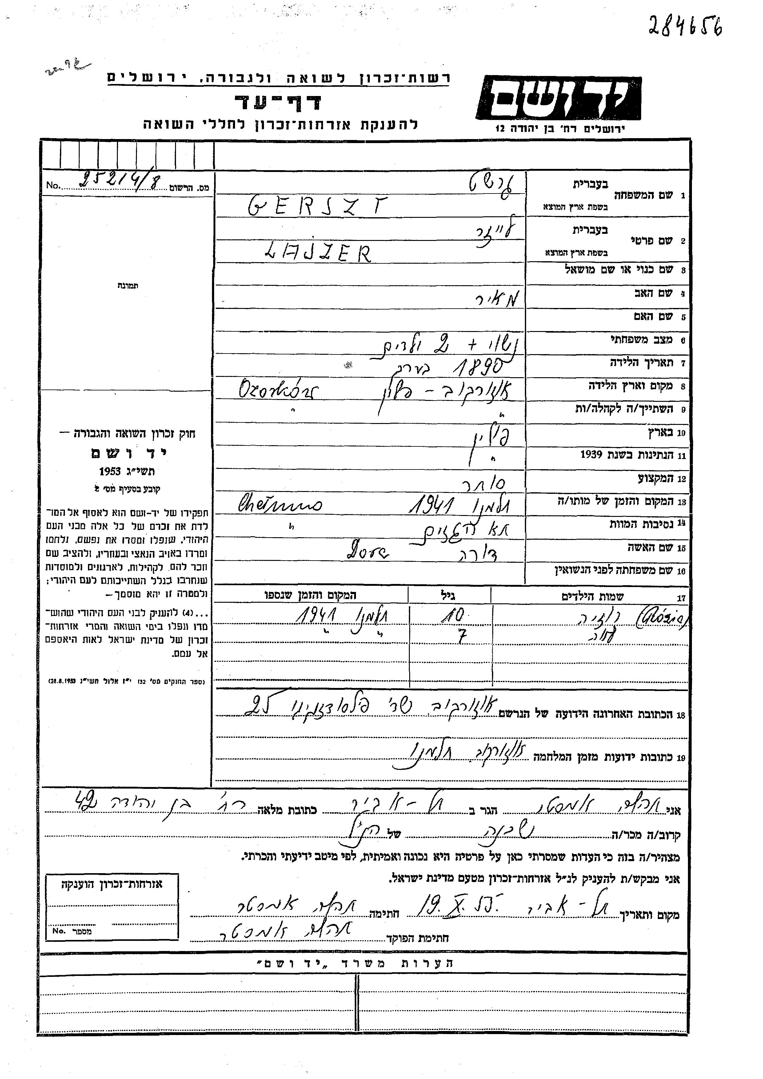 לאה Gerszt נולדה לLajzer ודורה. היא היתה ילדה. לפני מלחמת העולם השניה התגוררה בOzorkow שבפולין. בזמן המלחמה היא היתה בOzorkow שבפולין.