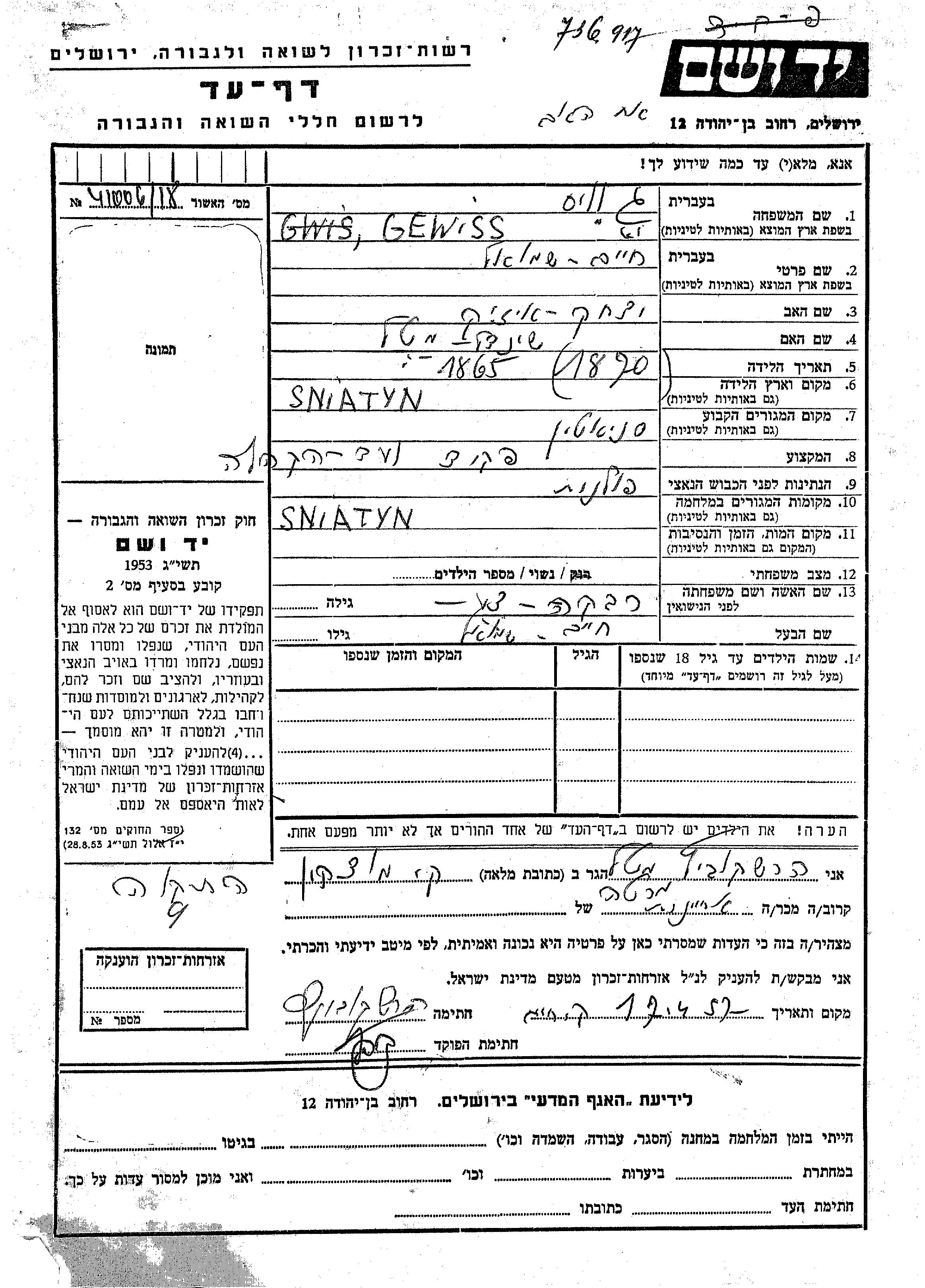 יד ושם - המפעל להנצחת השמות בדפי עד