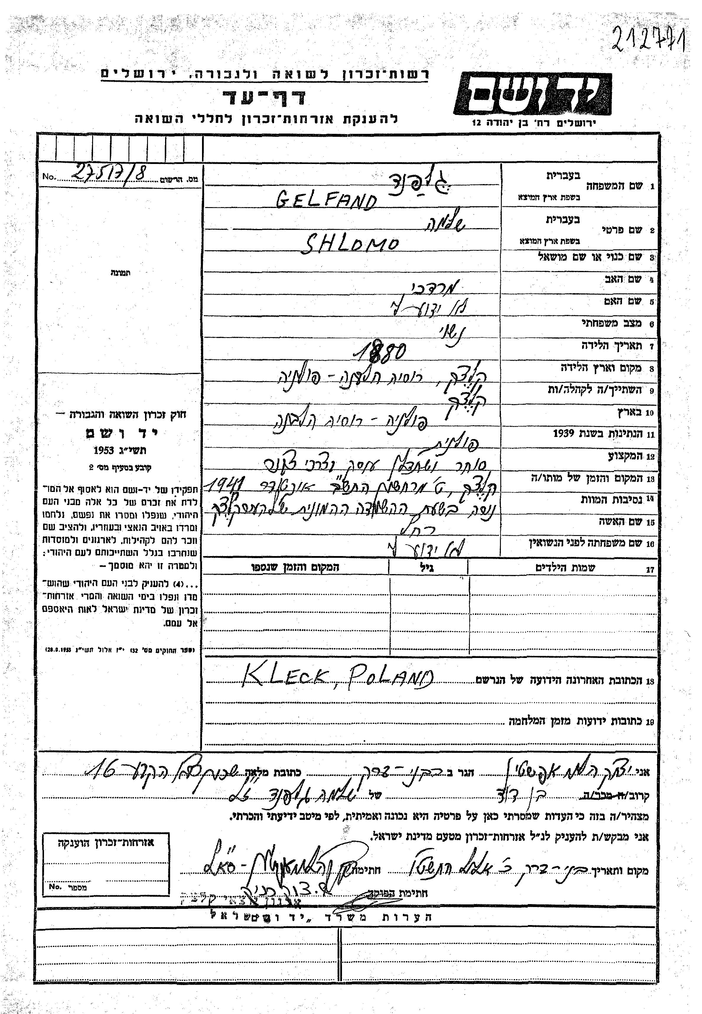 שלמה גלפנד נולד בKleck שבפולין בשנת 1880 למרדכי. הוא היה סוחר ונשוי לרחל. לפני מלחמת העולם השניה התגורר בKleck שבפולין. בזמן המלחמה הוא היה בKleck שבפולין. שלמה נרצח בשואה. מקום המוות: Kleck שבפולין בשנת 10/1941.