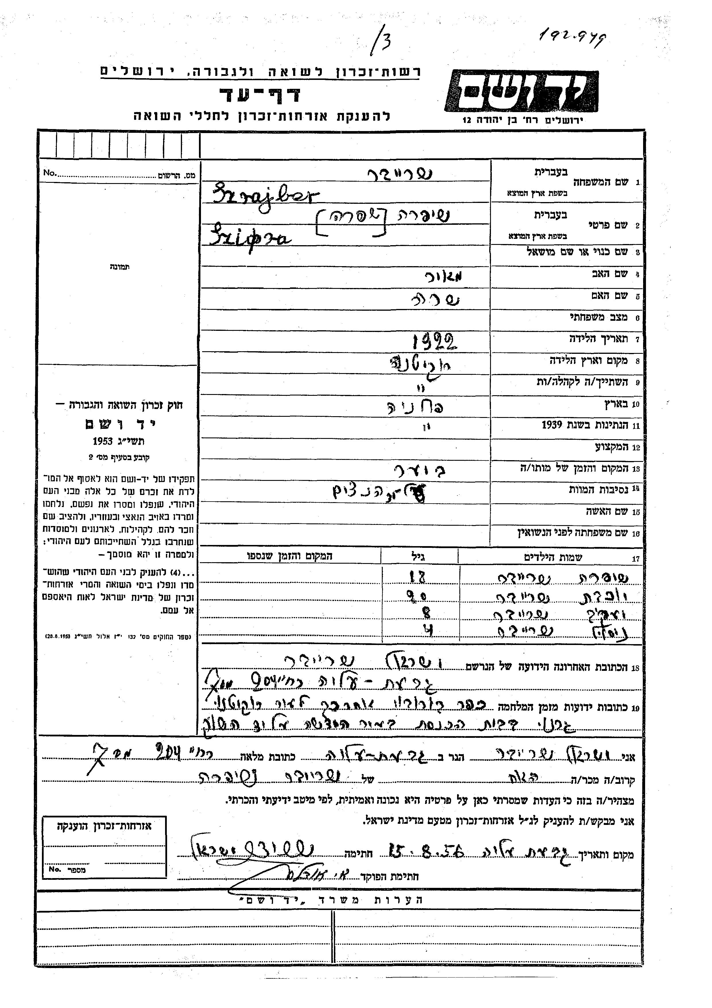 שיפרה Szrajber נולדה לSzifra. היא היתה ילדה. לפני מלחמת העולם השניה התגוררה בRokitno שבפולין. בזמן המלחמה היא היתה בRokitno שבפולין.