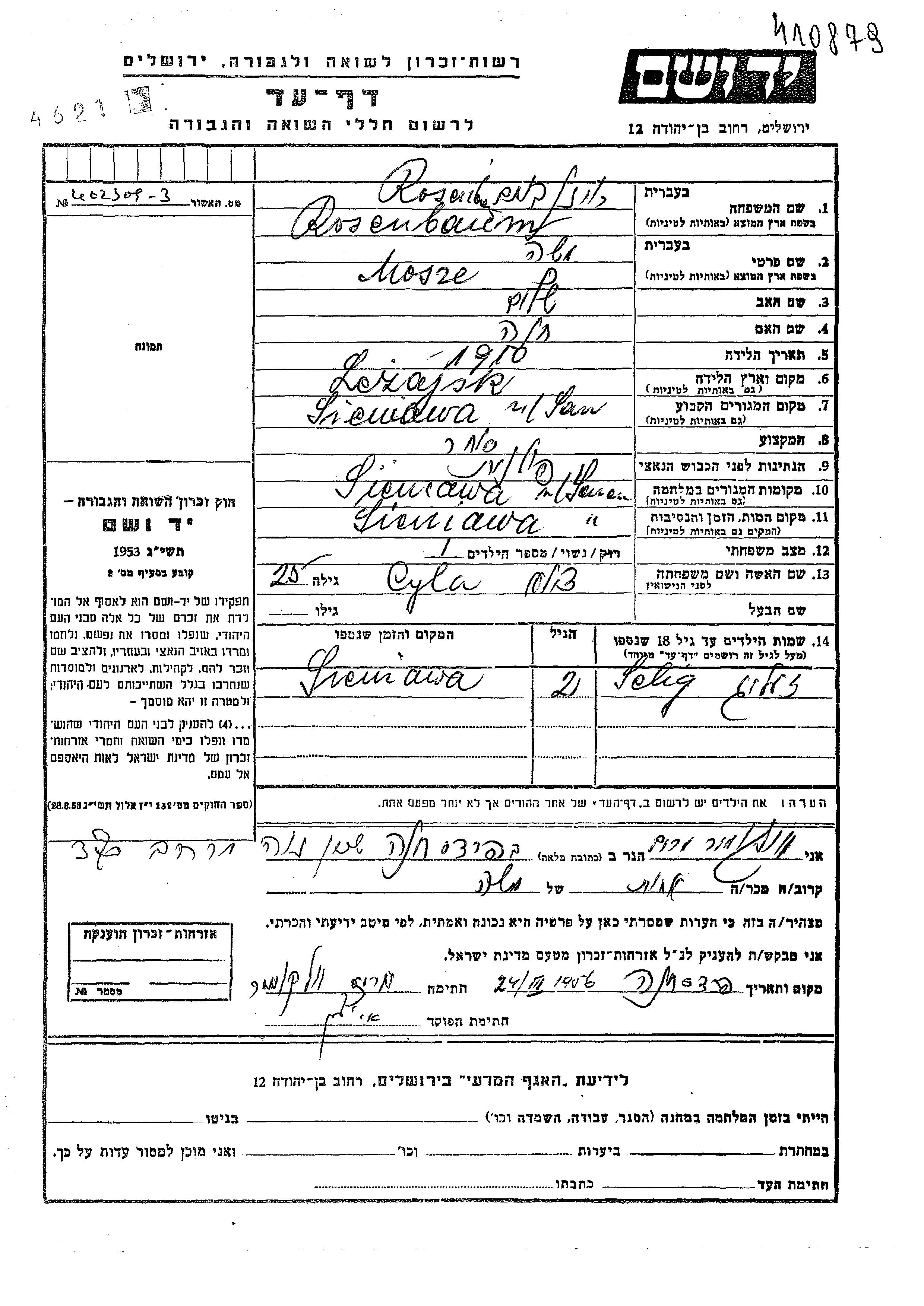 יד ושם - המפעל להנצחת השמות בדפי עד