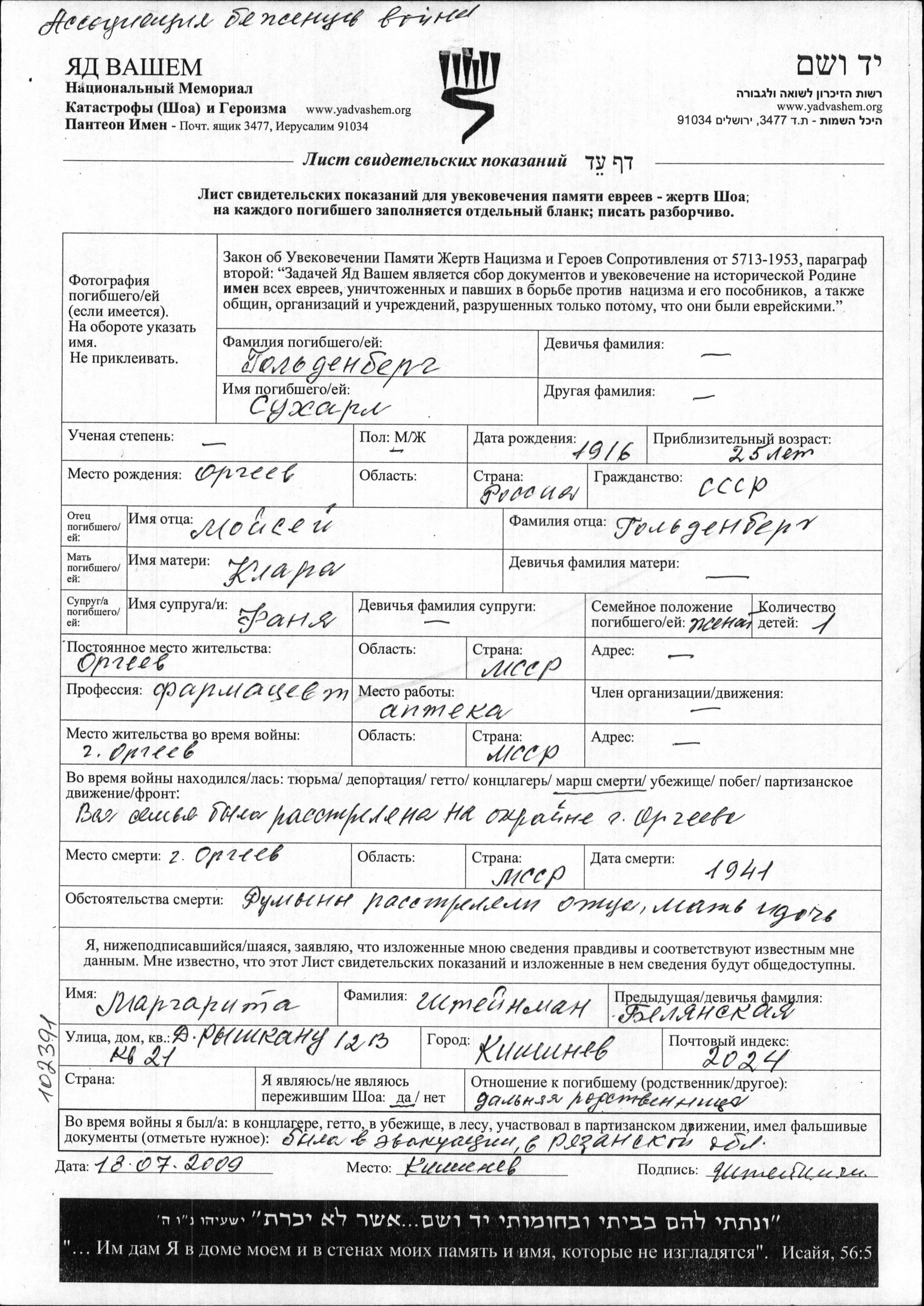 הוא נרצח בשואה. מקום המוות: Orgeyev שברומניה בשנת 1941.