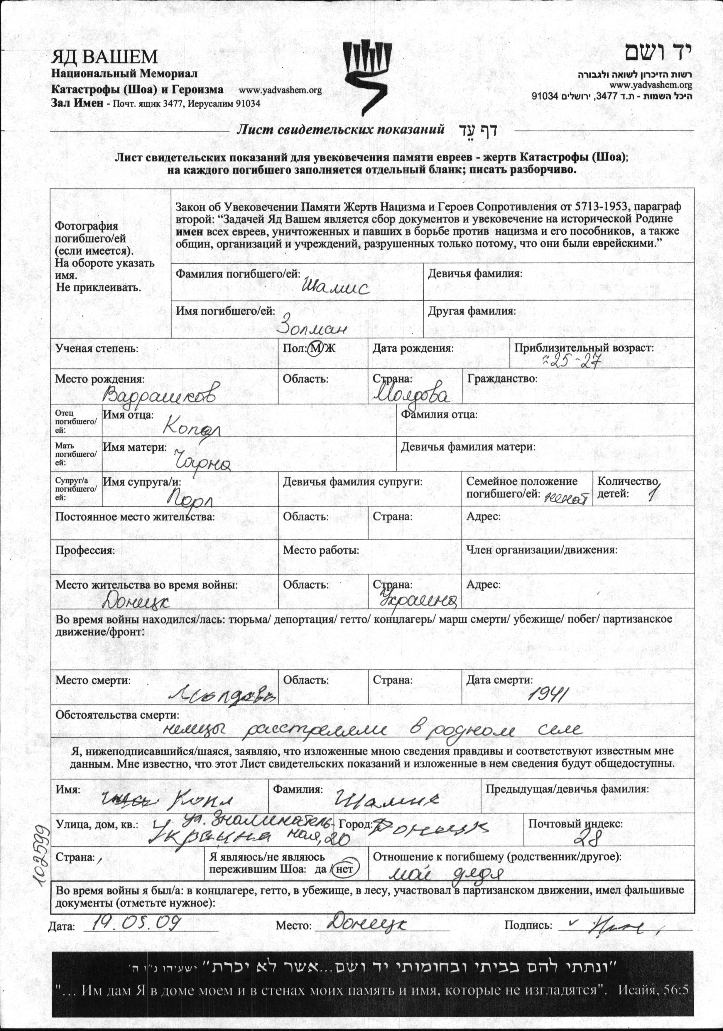 Zolman שמיס נולד בVadrazhkov שברומניה לKopel וצארנה. הוא היה נשוי לPerl. בזמן המלחמה הוא היה בDonetsk שבאוקראינה (ברה"מ).