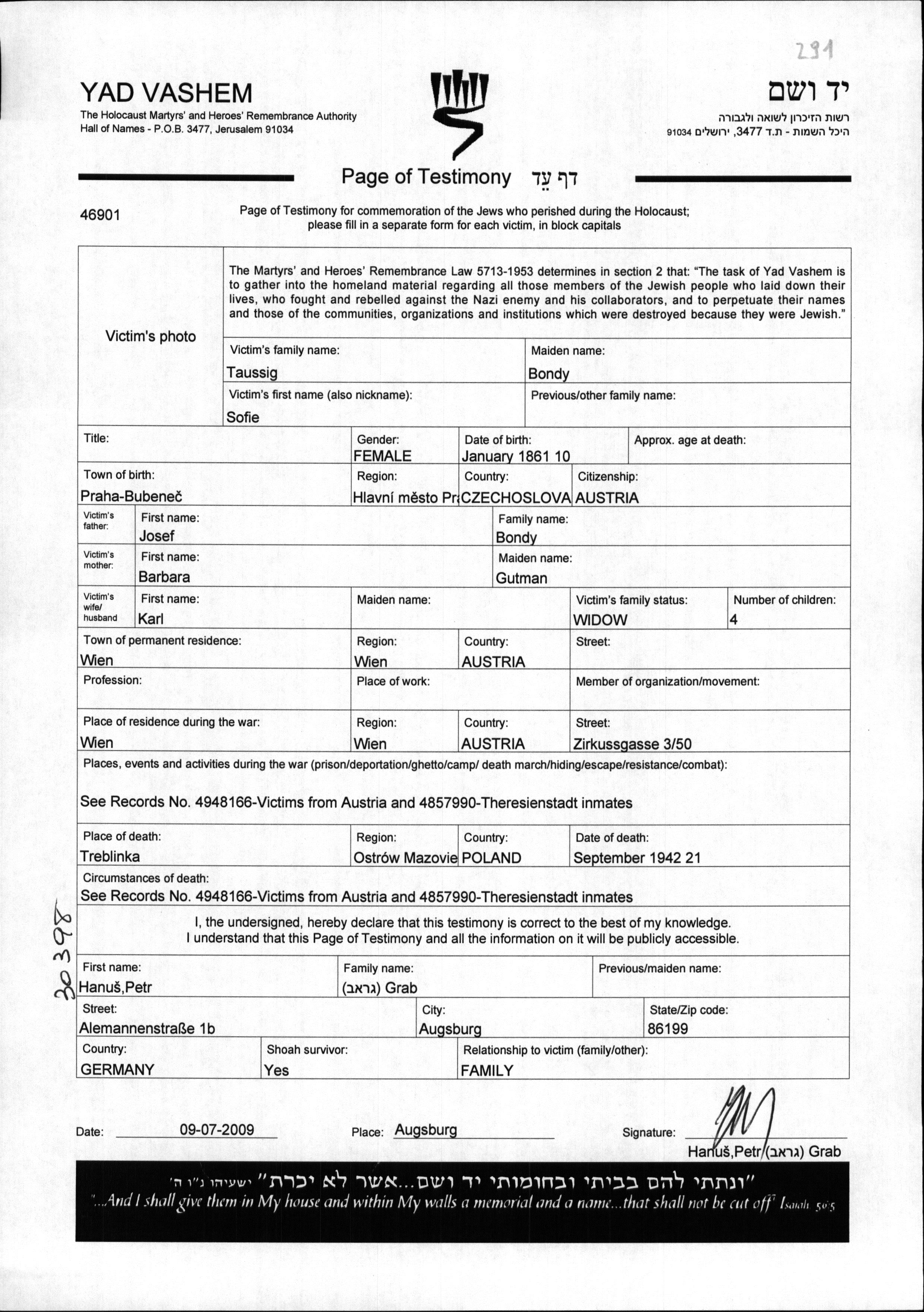 Sofie Taussig לבית Bondy נולדה בPraha שבצ'כוסלובקיה בשנת 1861 לJosef וברברה לבית גוטמן. היא היתה אלמנה לקרל. לפני מלחמת העולם השניה התגוררה בWien שבאוסטריה. בזמן המלחמה היא היתה בWien שבאוסטריה. היא נרצחה בשואה. מקום המוות: Treblinka שבפולין בשנת 21/09/1942.