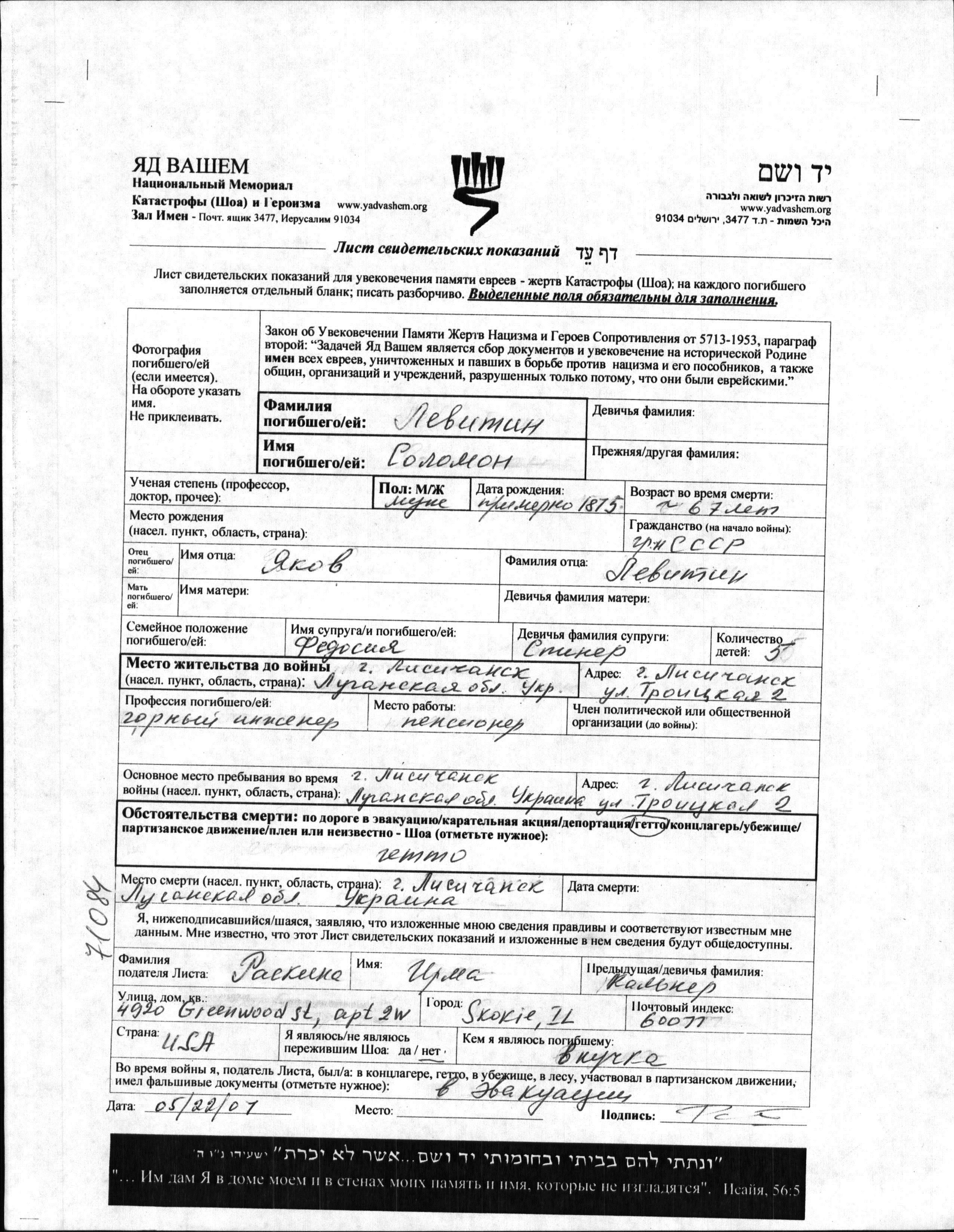 סולומון נרצח בשואה. מקום המוות: Lisichansk שבאוקראינה (ברה"מ).