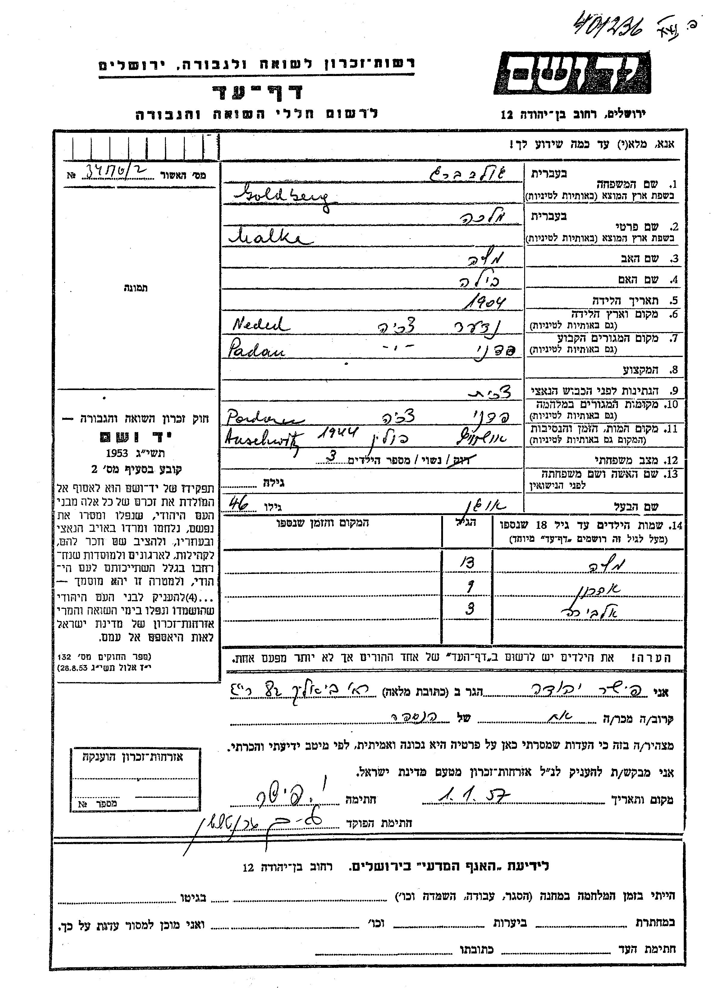 יד ושם - המפעל להנצחת השמות בדפי עד