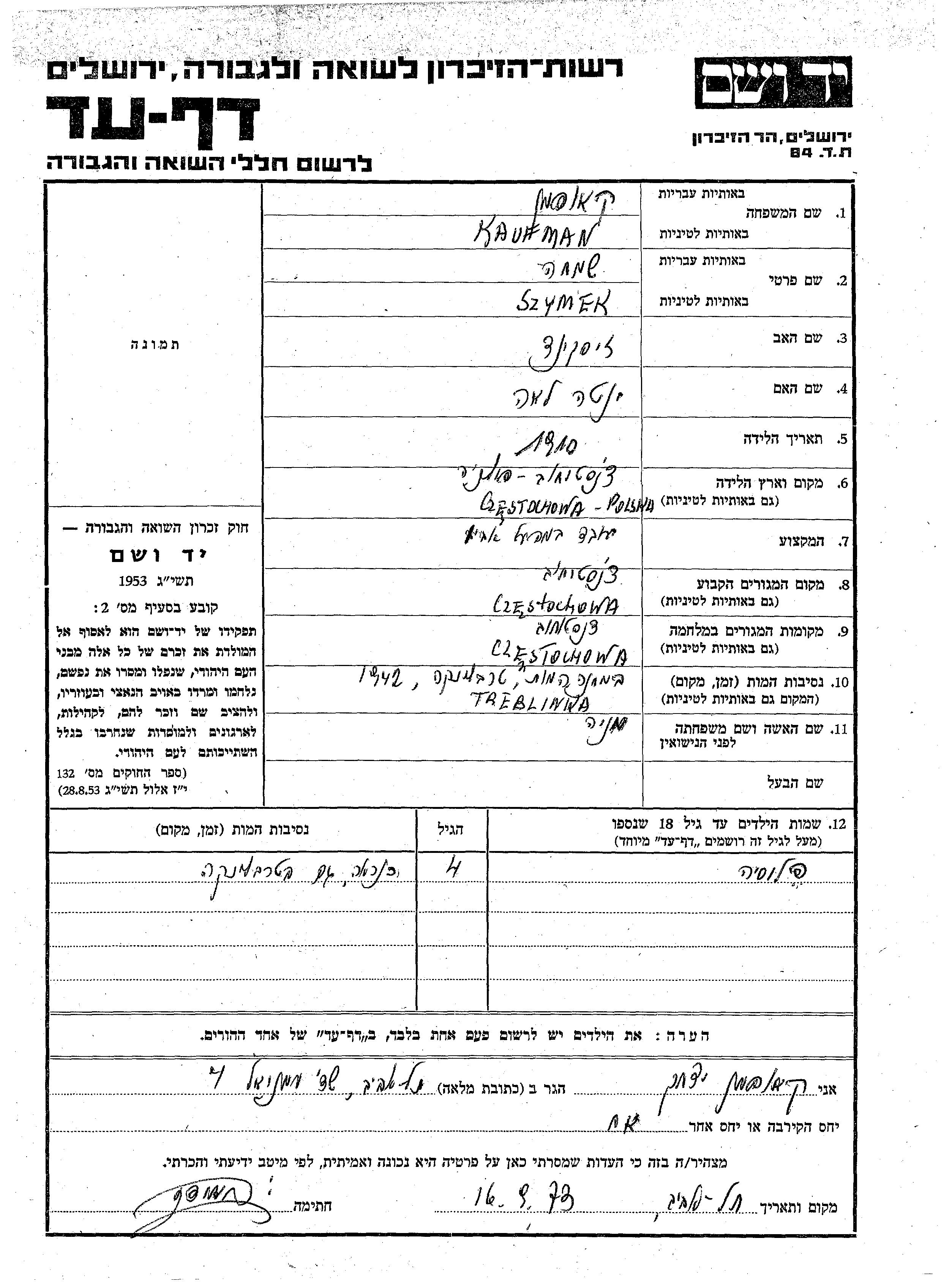 פליסיה קאופמן נולדה לSzymek שמחה ומניה. היא היתה ילדה. לפני מלחמת העולם השניה התגוררה בCzestochowa שבפולין. בזמן המלחמה היא היתה בCzestochowa שבפולין. פליסיה נרצחה בשואה.