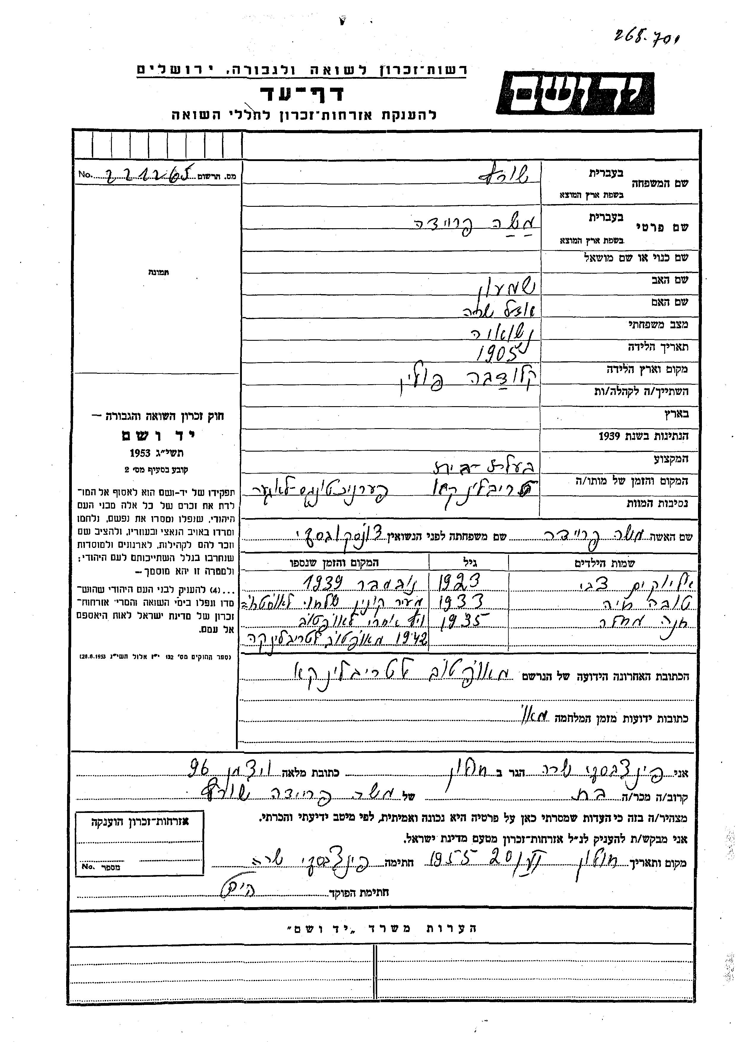 שורץ טובה חיה 1933 מקום לא רשום, דף-עד