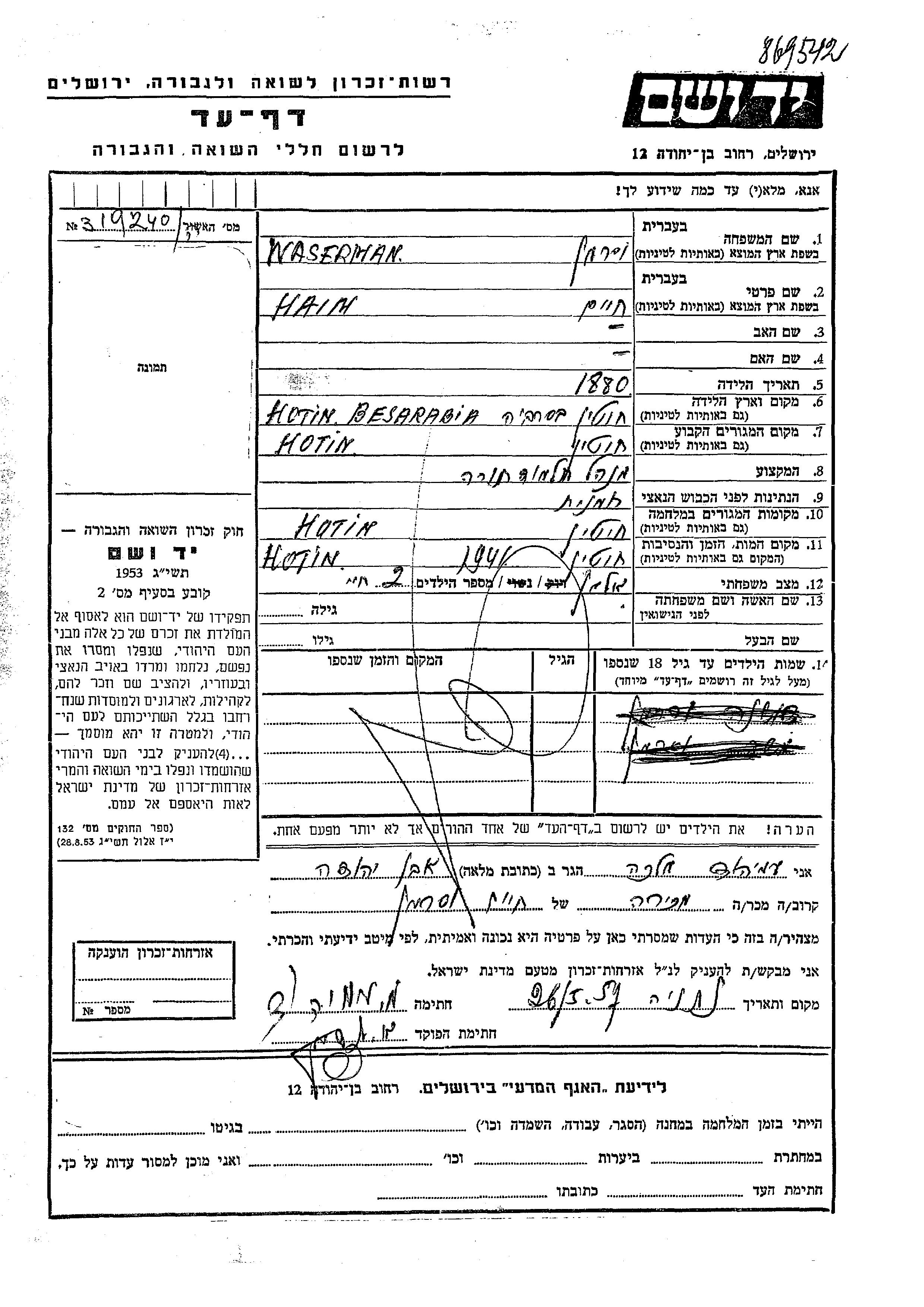 משה Waserman נולד לHaim. הוא היה ילד. לפני מלחמת העולם השניה התגורר בHotin שברומניה. בזמן המלחמה הוא היה בHotin שברומניה.