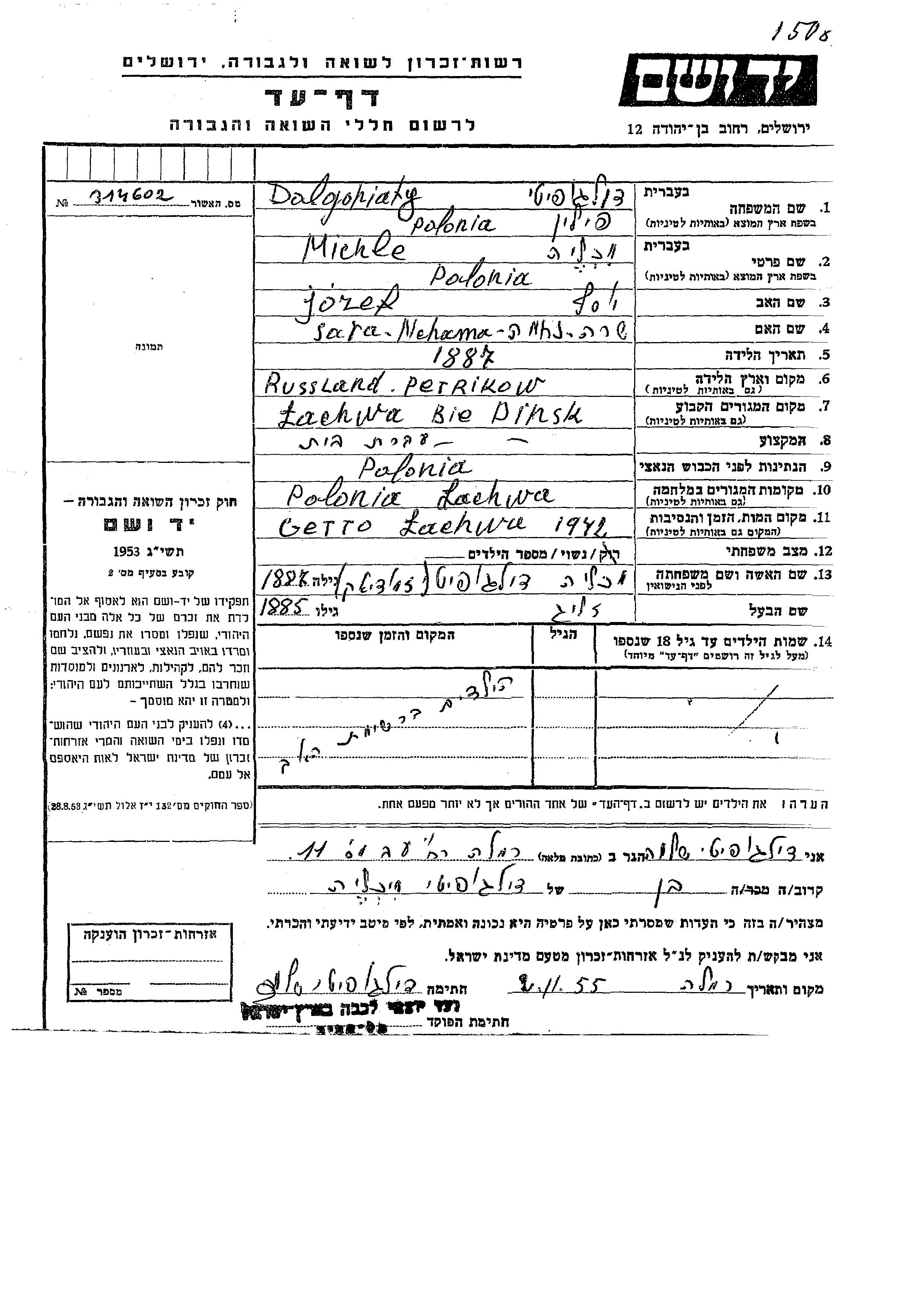 Michle מכליה Dolgopiaty לבית זמודיאק נולדה בPetrikov שבביאלורוסיה (ברה"מ) בשנת 1887 לJozef וNehama שרה. היא היתה עקרת בית ונשואה לזליג. לפני מלחמת העולם השניה התגוררה בLachwa שבפולין. בזמן המלחמה היא היתה בLachwa שבפולין. היא נרצחה בשואה. מקום המוות: Lachwa שבפולין בשנת 1942.