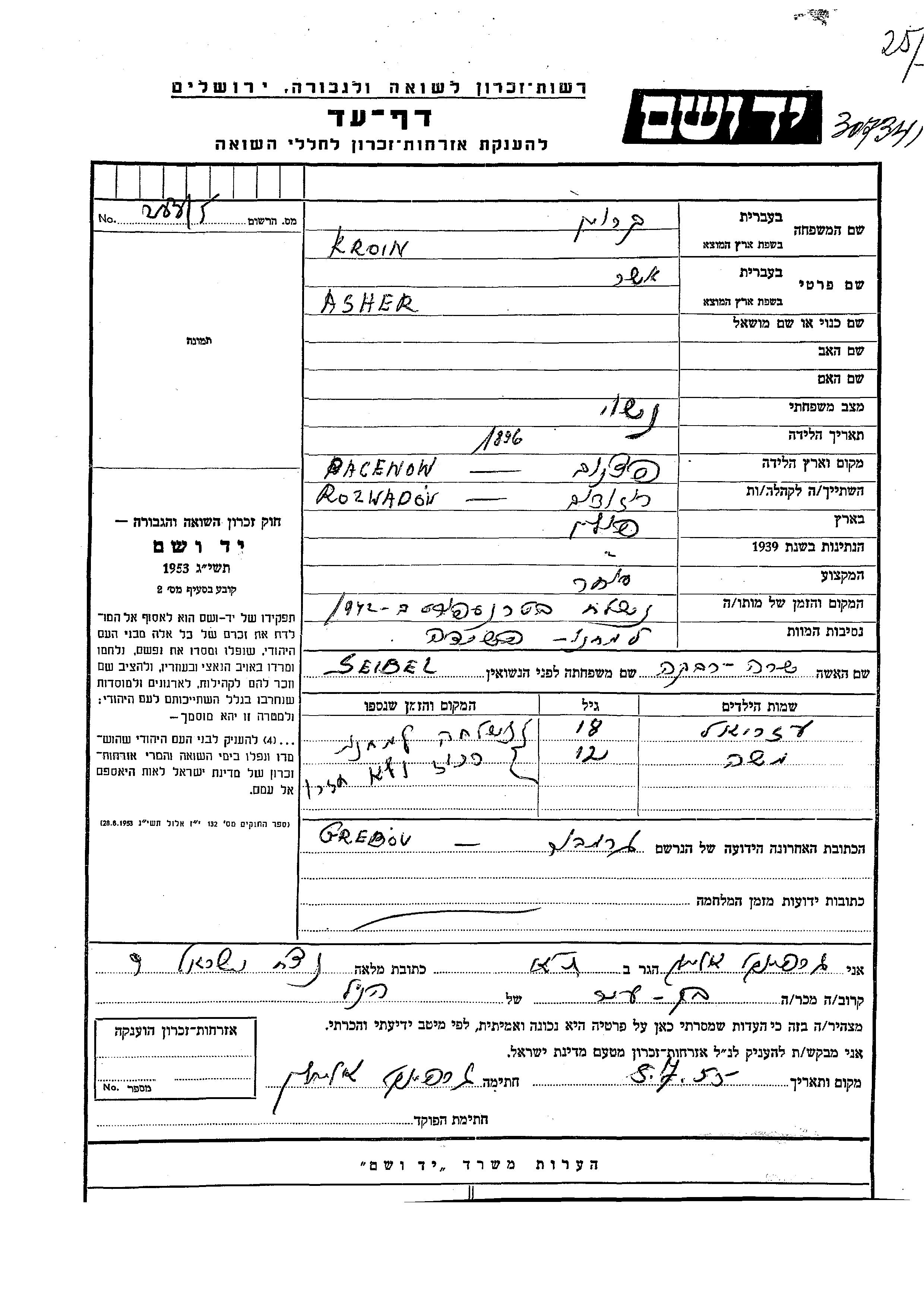 עזריאל קרוין נולד לאשר ושרה רבקה לבית סיידל. הוא היה ילד. לפני מלחמת העולם השניה התגורר בRozwadów שבפולין. בזמן המלחמה הוא היה בGrebow שבפולין.