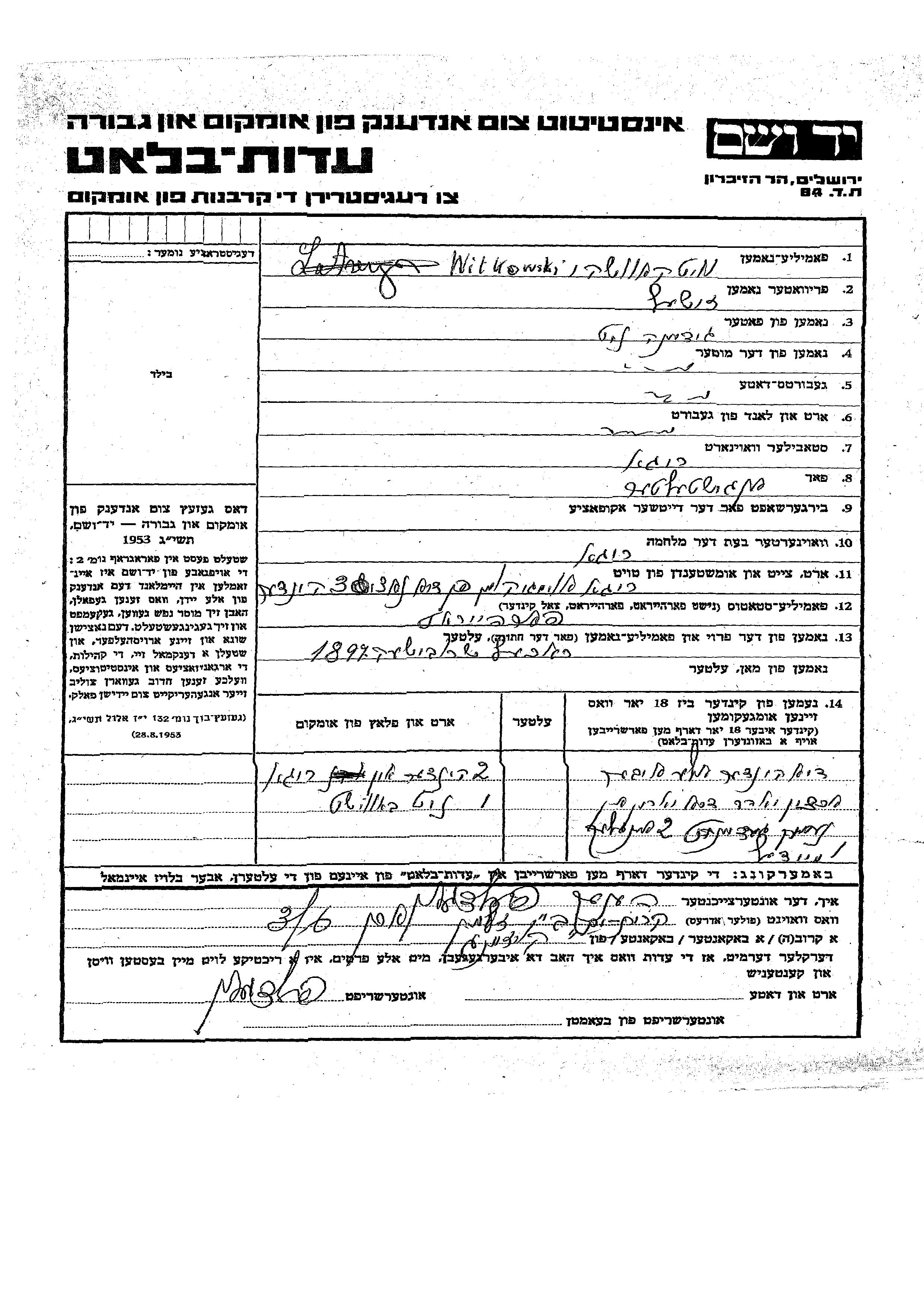 זישעל Witkowski. הוא היה שכיר ונשוי לרפאל. לפני מלחמת העולם השניה התגורר בRiga שבלטביה. בזמן המלחמה הוא היה בRiga שבלטביה. זישעל נרצח בשואה. מקום המוות: Riga שבלטביה.