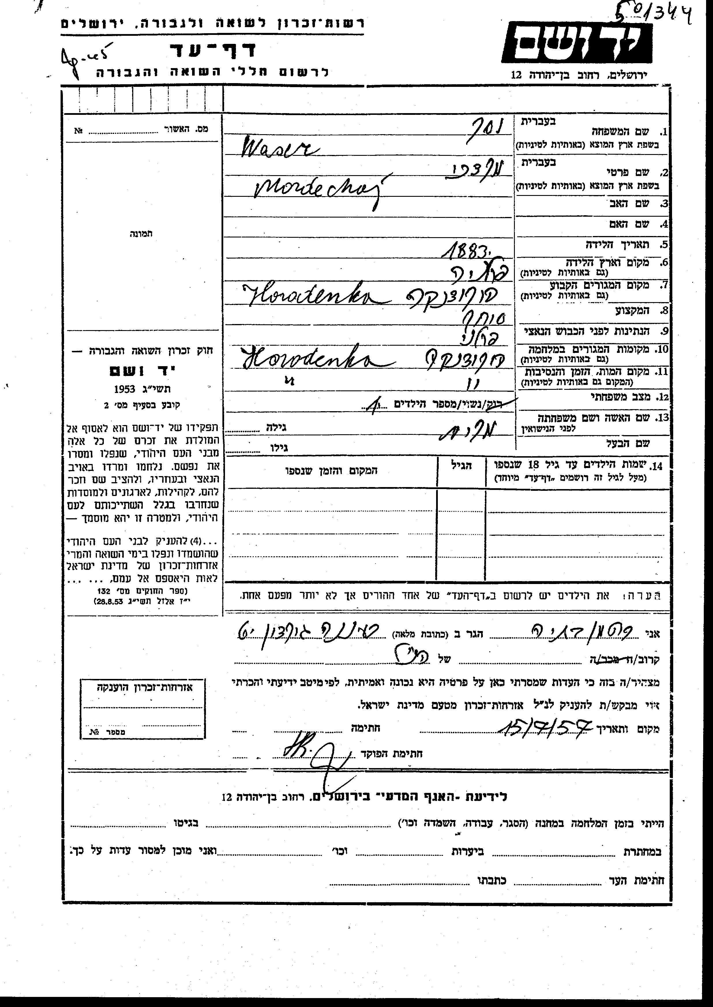 Mordechai Waser נולד בפולין בשנת 1883. הוא היה סוחר ונשוי למרים. לפני מלחמת העולם השניה התגורר בHorodenka שבפולין. בזמן המלחמה הוא היה בHorodenka שבפולין. הוא נרצח בשואה. מקום המוות: Horodenka שבפולין.