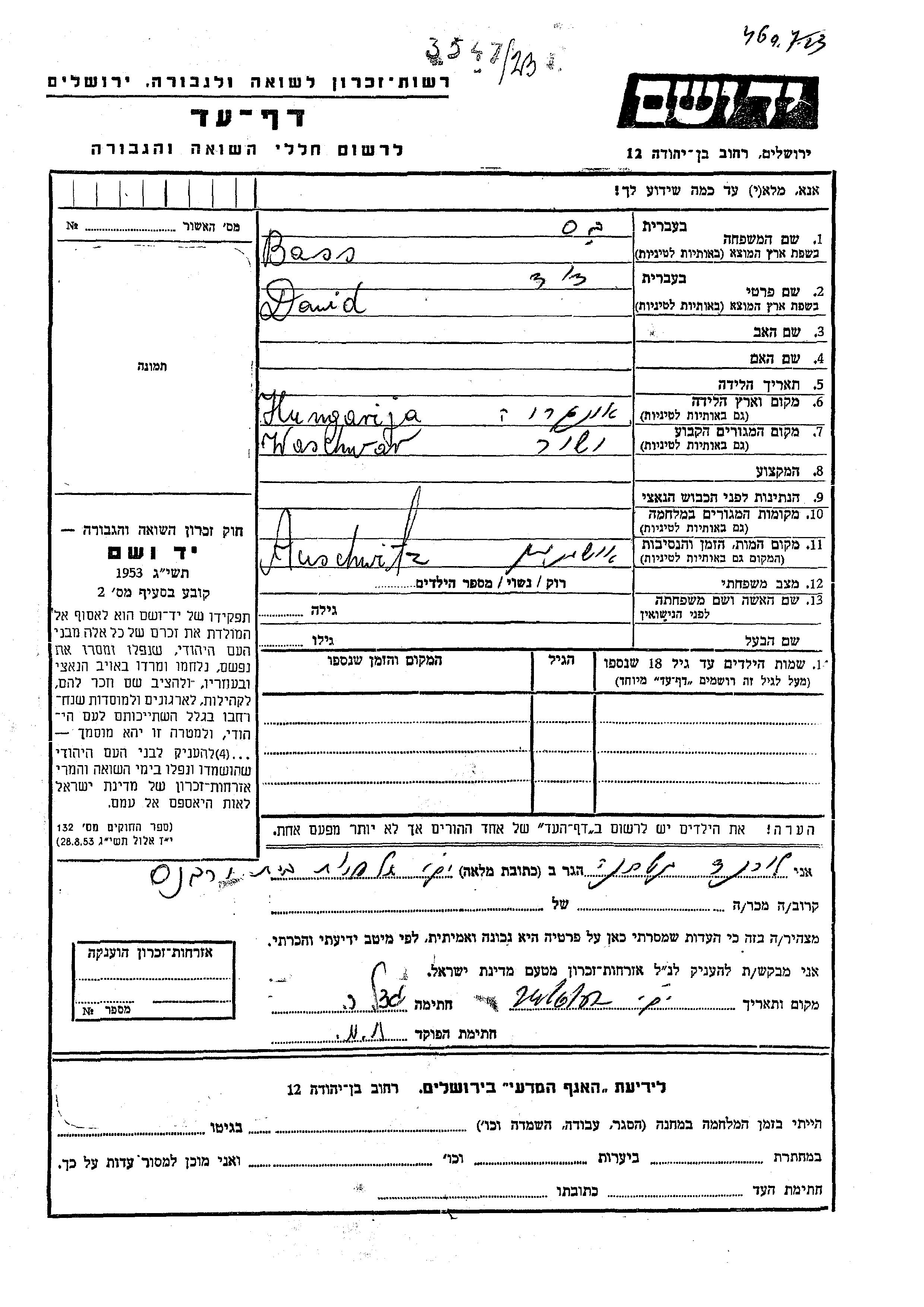 Dawid Bass נולד בהונגריה. הוא היה רווק. לפני מלחמת העולם השניה התגורר בWaschvar שבהונגריה.