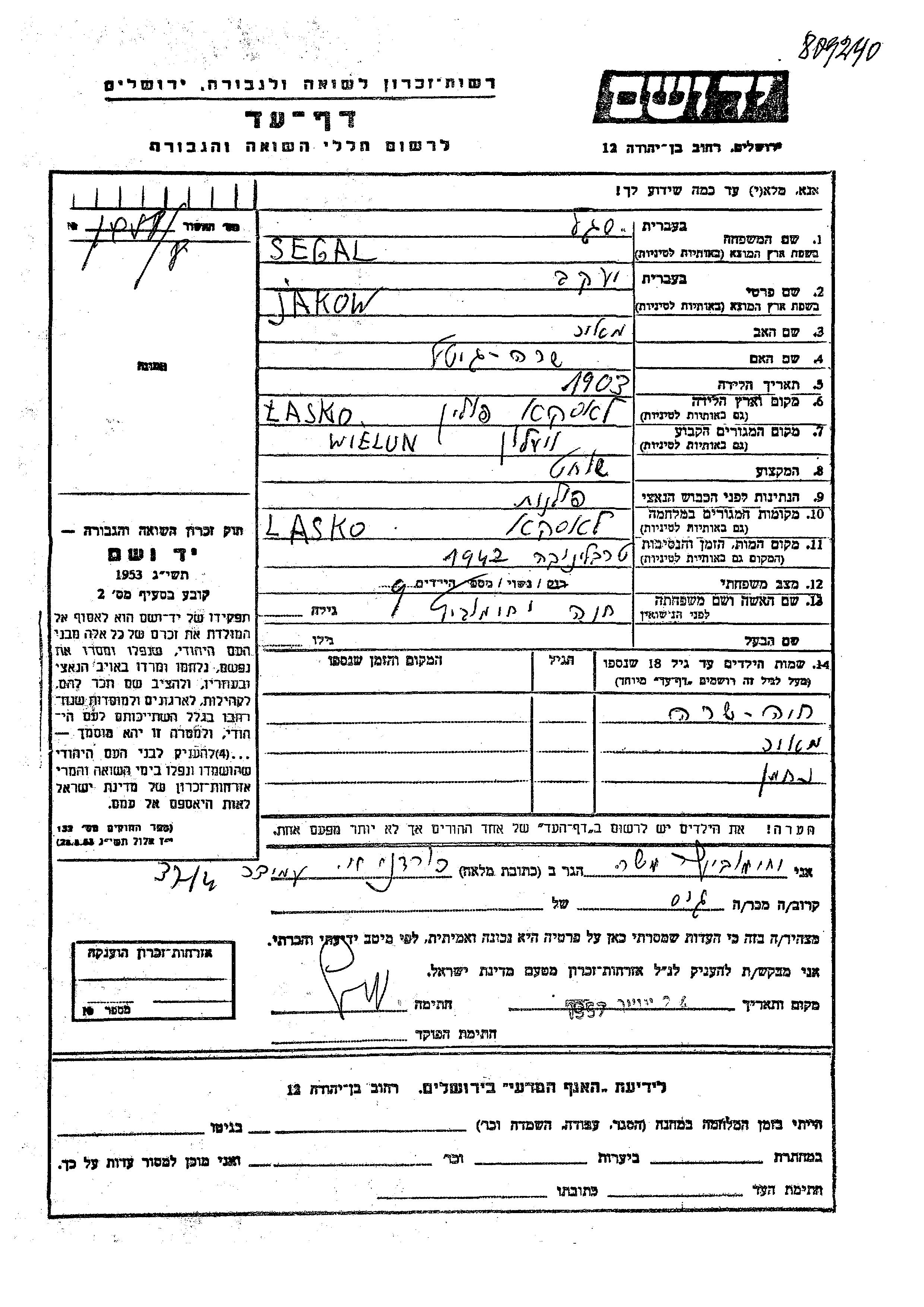 מאיר סגל נולד לJakow וחנה לבית יחימוביץ. הוא היה ילד. לפני מלחמת העולם השניה התגורר בWielun שבפולין. בזמן המלחמה הוא היה בWielun שבפולין. מאיר נרצח בשואה.