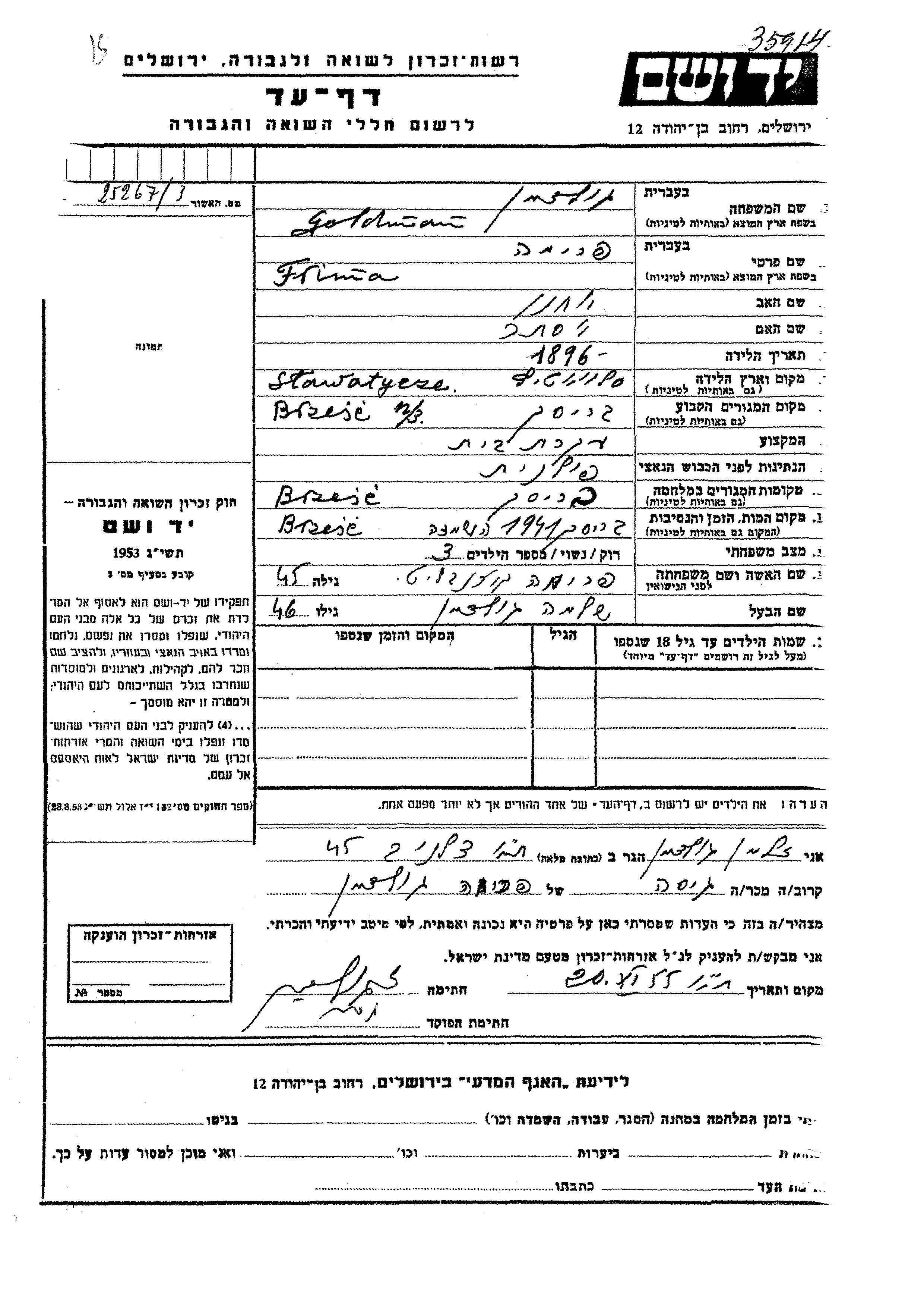 Frima גולדמן לבית קוזנבליט נולדה בSlawatycze שבפולין בשנת 1896 ליוחנן ואסתר. היא היתה עקרת בית ונשואה לשלמה. לפני מלחמת העולם השניה התגוררה בBrześć nad Bugiem שבפולין. בזמן המלחמה היא היתה בBrześć nad Bugiem שבפולין. היא נרצחה בשואה. מקום המוות: Brześć nad Bugiem שבפולין בשנת 1941.