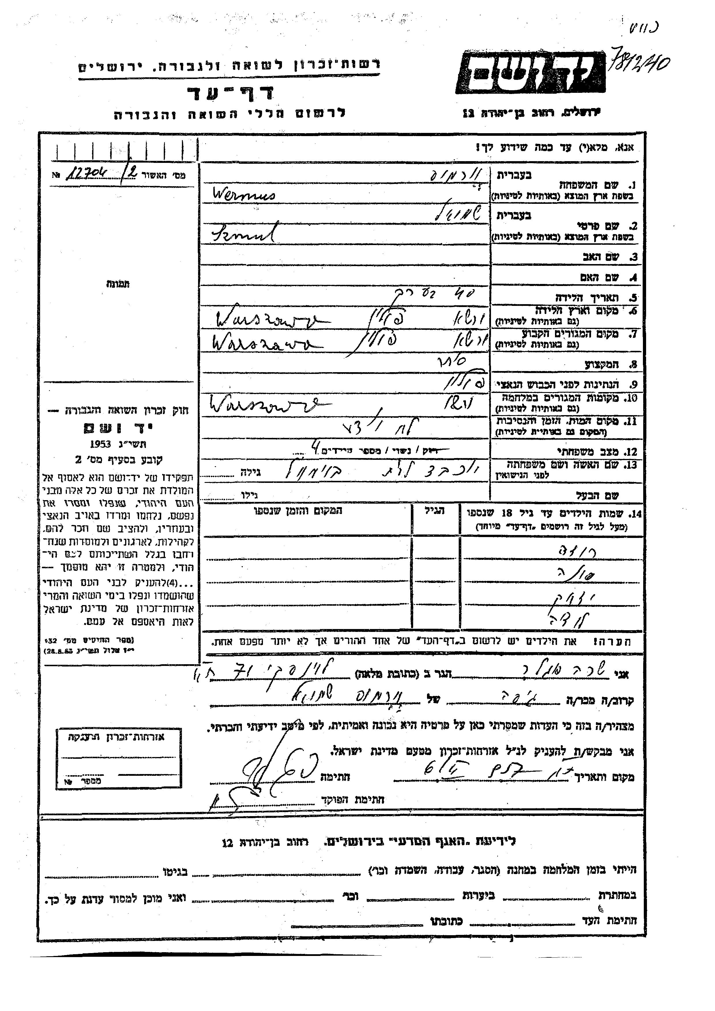 אנה Wermus נולד/ה לSzmul ויוכבד לבית בוימוול. הוא/היא היה/היתה ילד/ילדה. לפני מלחמת העולם השניה התגורר/התגוררה בWarszawa שבפולין. בזמן המלחמה הוא/היא היה/היתה בWarszawa שבפולין.