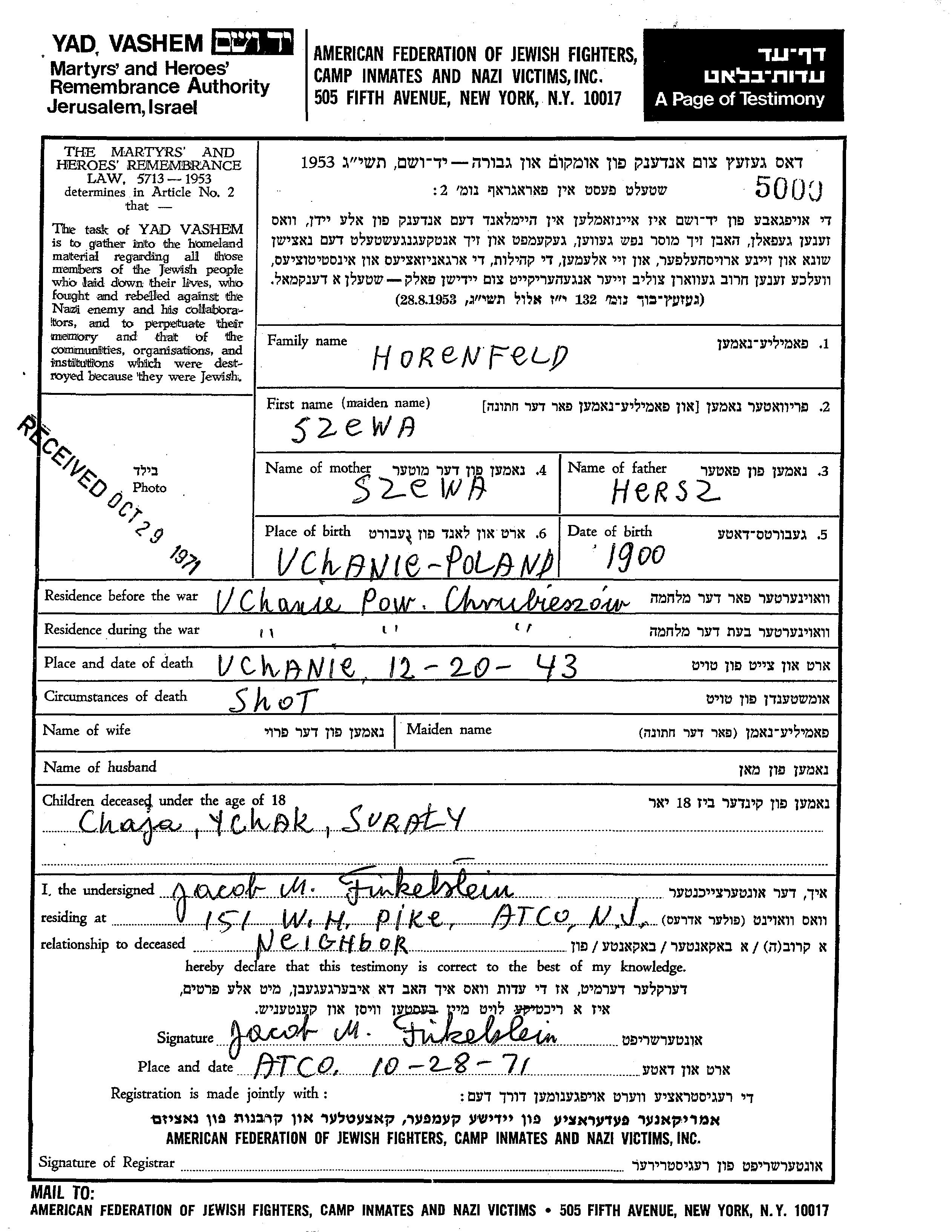 Ychak Horenfeld נולד לSzewa. הוא היה ילד. לפני מלחמת העולם השניה התגורר בUchanie שבפולין. בזמן המלחמה הוא היה בUchanie שבפולין.