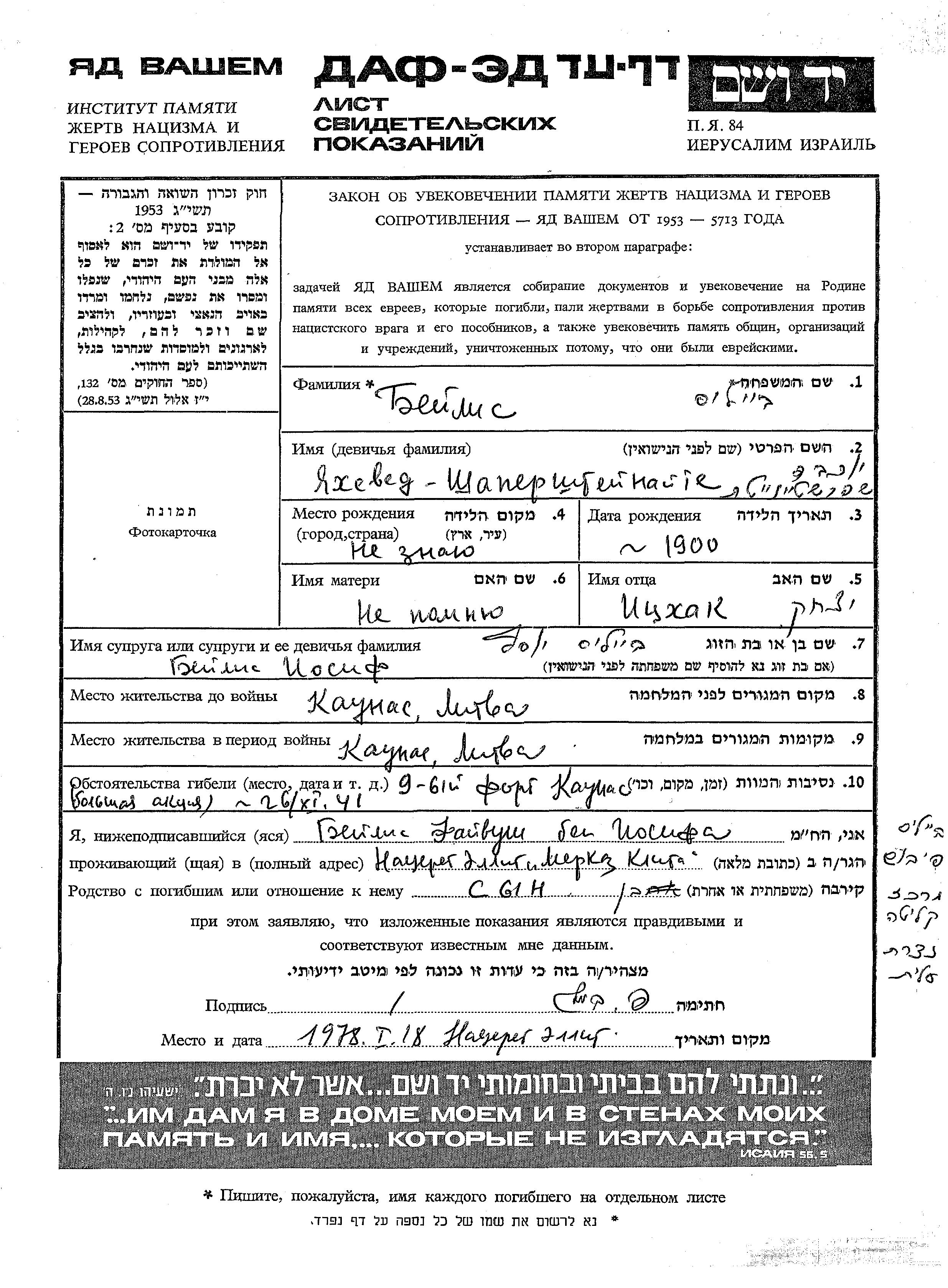 Yakheved בייליס לבית שפרשטיין נולדה בשנת 1900 ליצחק. היא היתה נשואה לIosif. לפני מלחמת העולם השניה התגוררה בKaunas שבליטא. בזמן המלחמה היא היתה בKaunas שבליטא. היא נרצחה בשואה. מקום המוות: Kaunas שבליטא בשנת 26/11/1941.