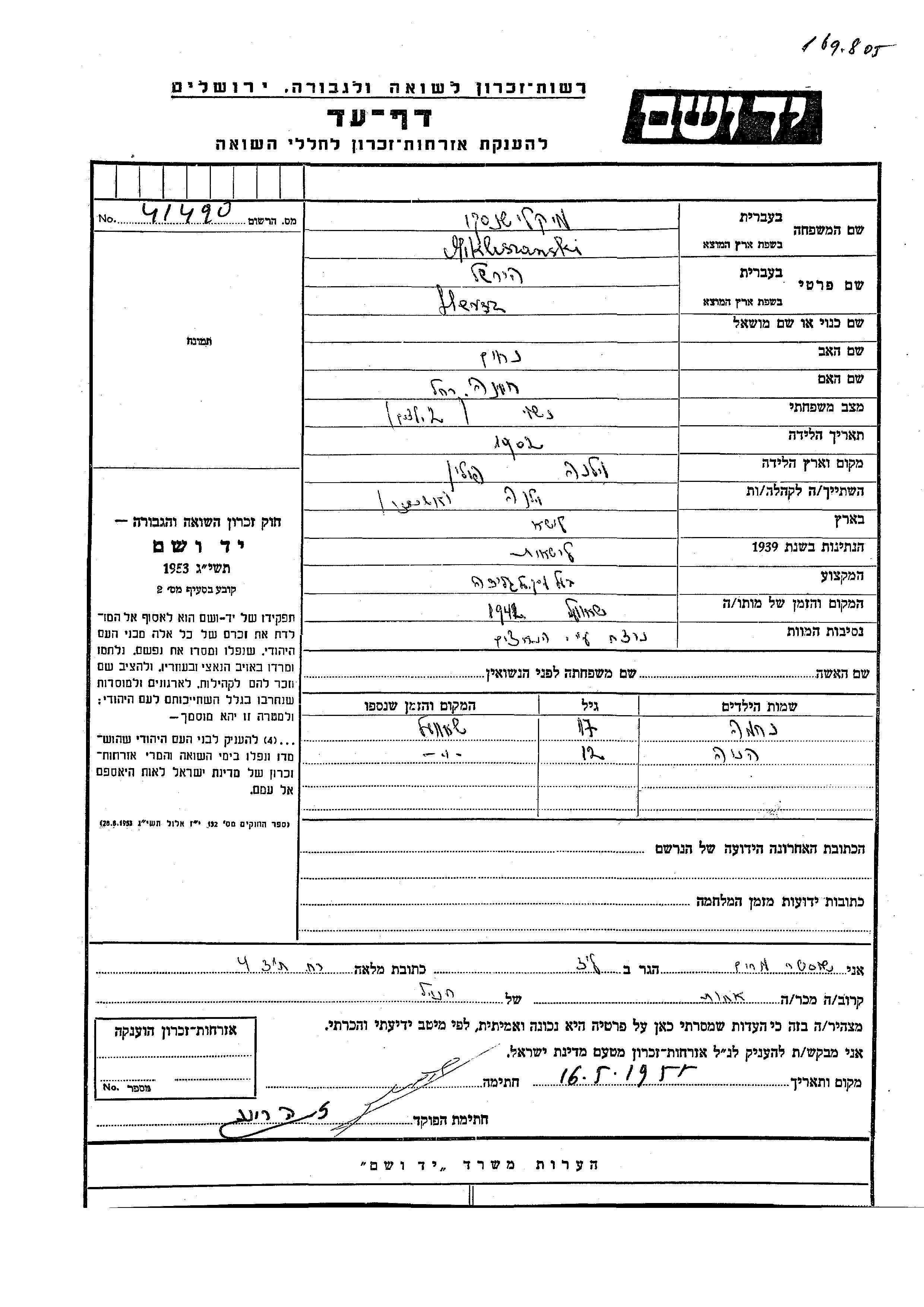 הניה Mikliszanski נולד/ה לHersz. הוא/היא היה/היתה ילד/ילדה. לפני מלחמת העולם השניה התגורר/התגוררה בWilno שבפולין.