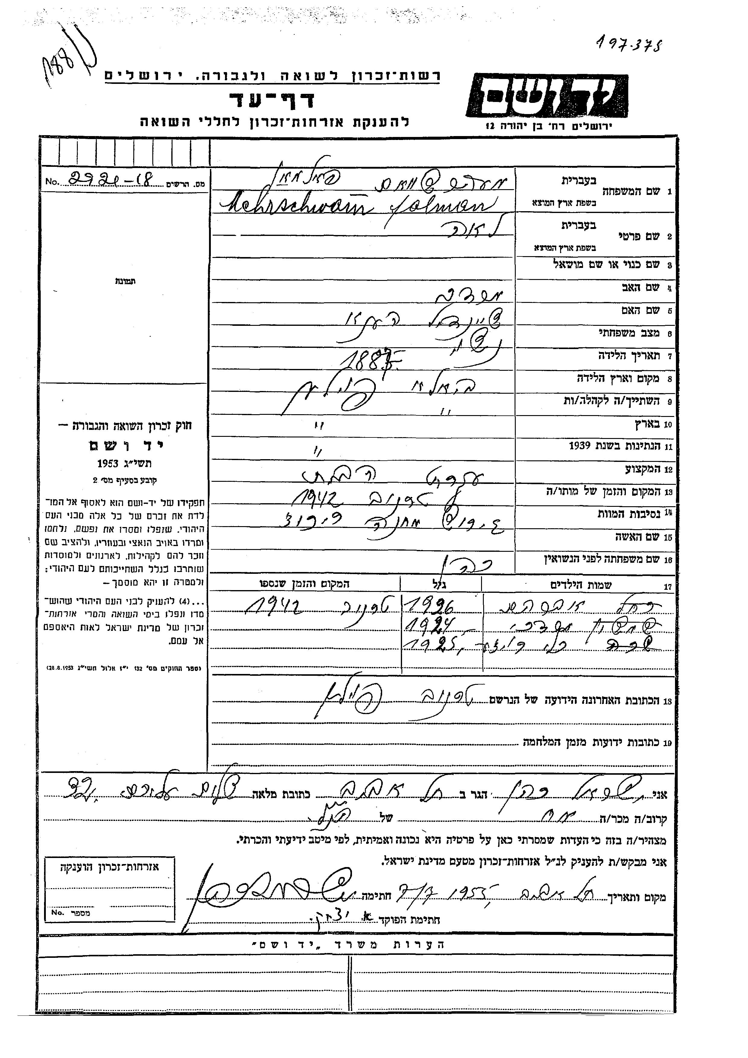 אברהם פלמן Mehrschwam נולד בשנת 1926 ללאה לבית כהן. הוא היה ילד. לפני מלחמת העולם השניה התגורר בBiala שבפולין. בזמן המלחמה הוא היה בTarnow שבפולין. אברהם נרצח בשואה.