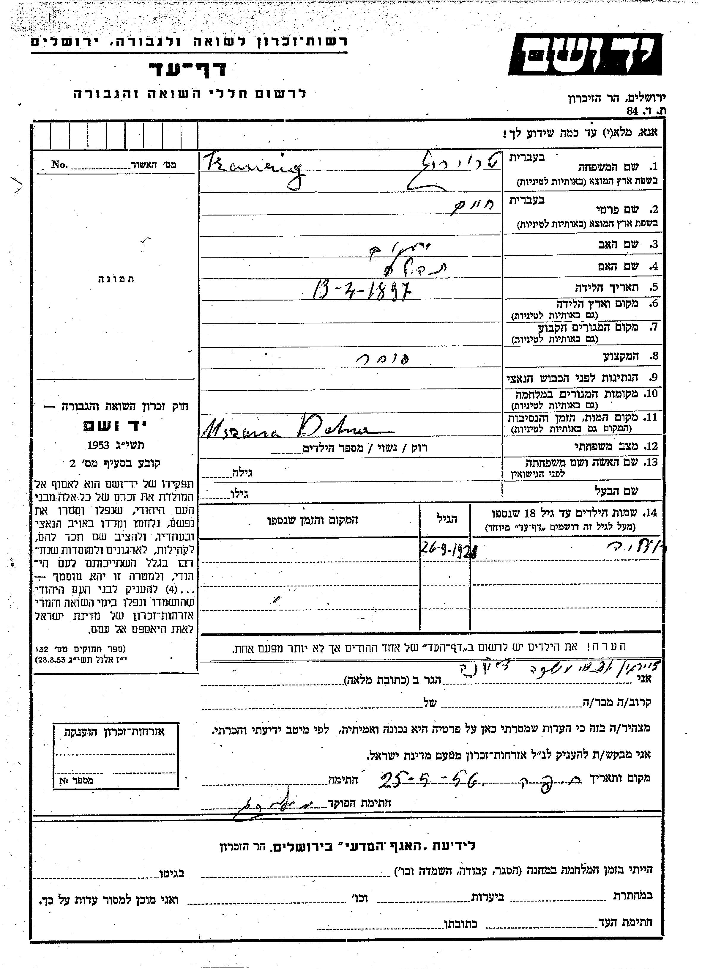 חיפוש שם מוסר דף העד. חיפוש לפי כל שם פרטי, כולל כינוי או שם חיבה