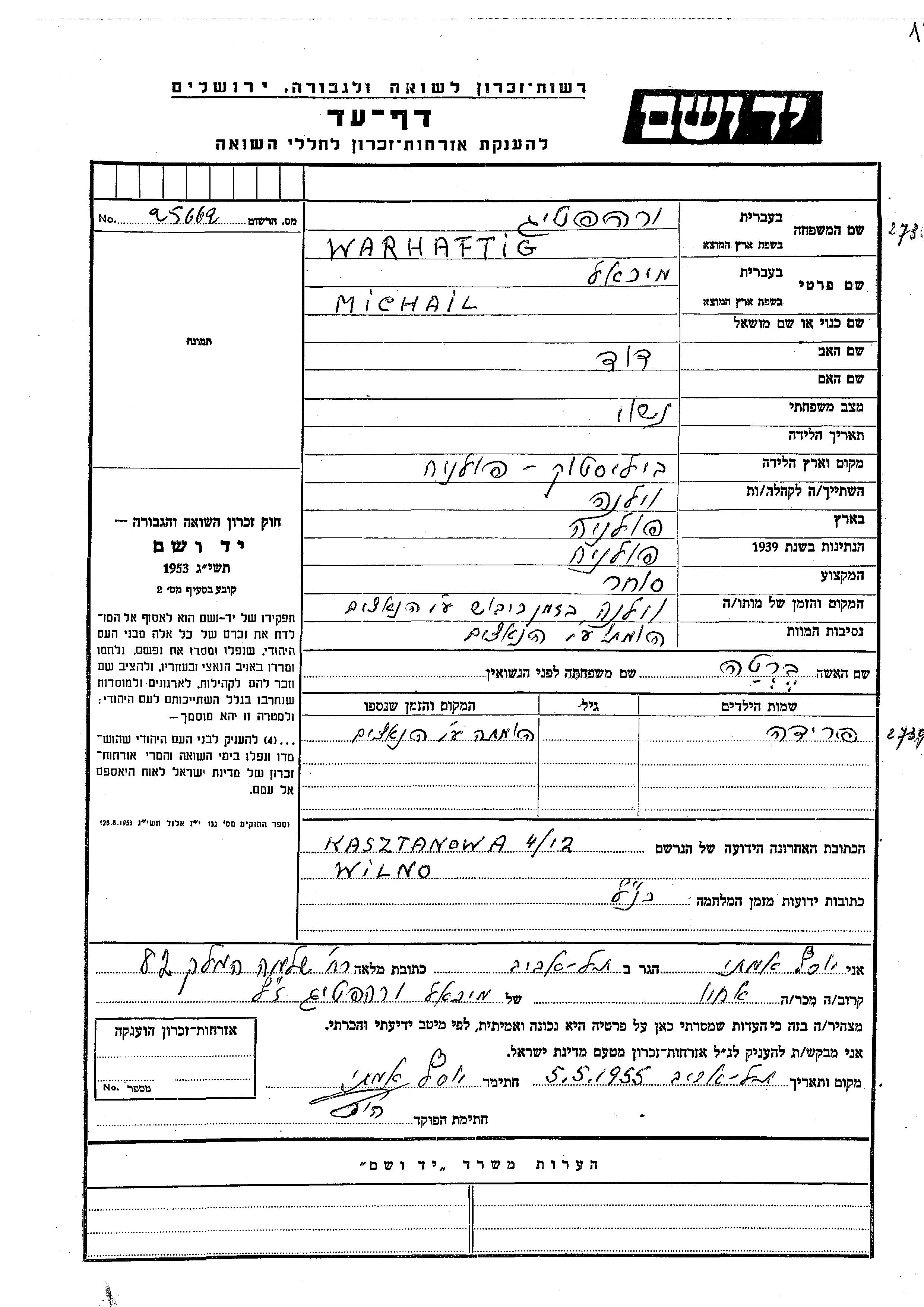 Warhaftig פרידה Wilno, פולין דף-עד