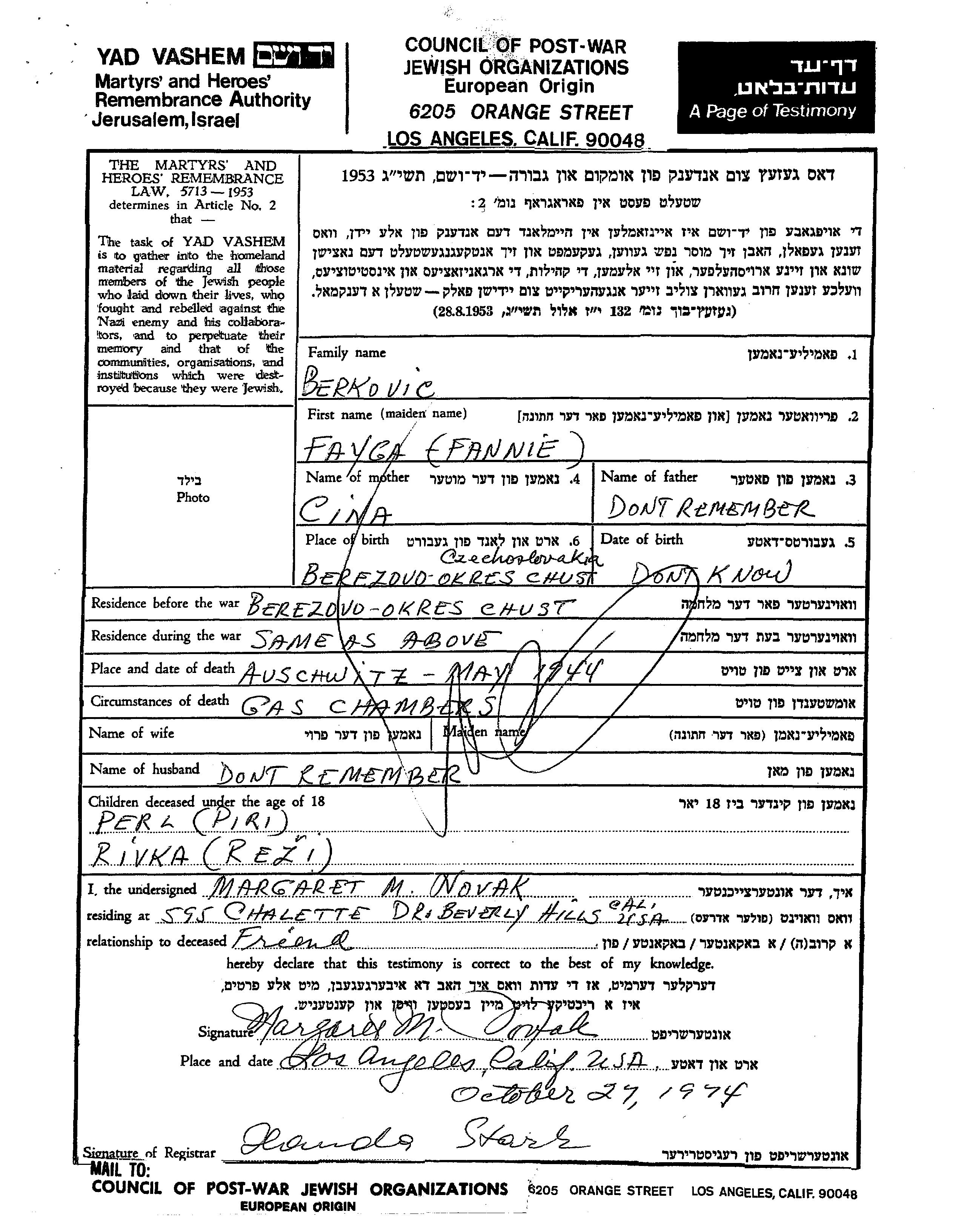 Perl Piri Berkovic נולדה לFayga Fannie. היא היתה ילדה. לפני מלחמת העולם השניה התגוררה בBerezovo שבצ'כוסלובקיה. בזמן המלחמה היא היתה בBerezovo שבצ'כוסלובקיה.
