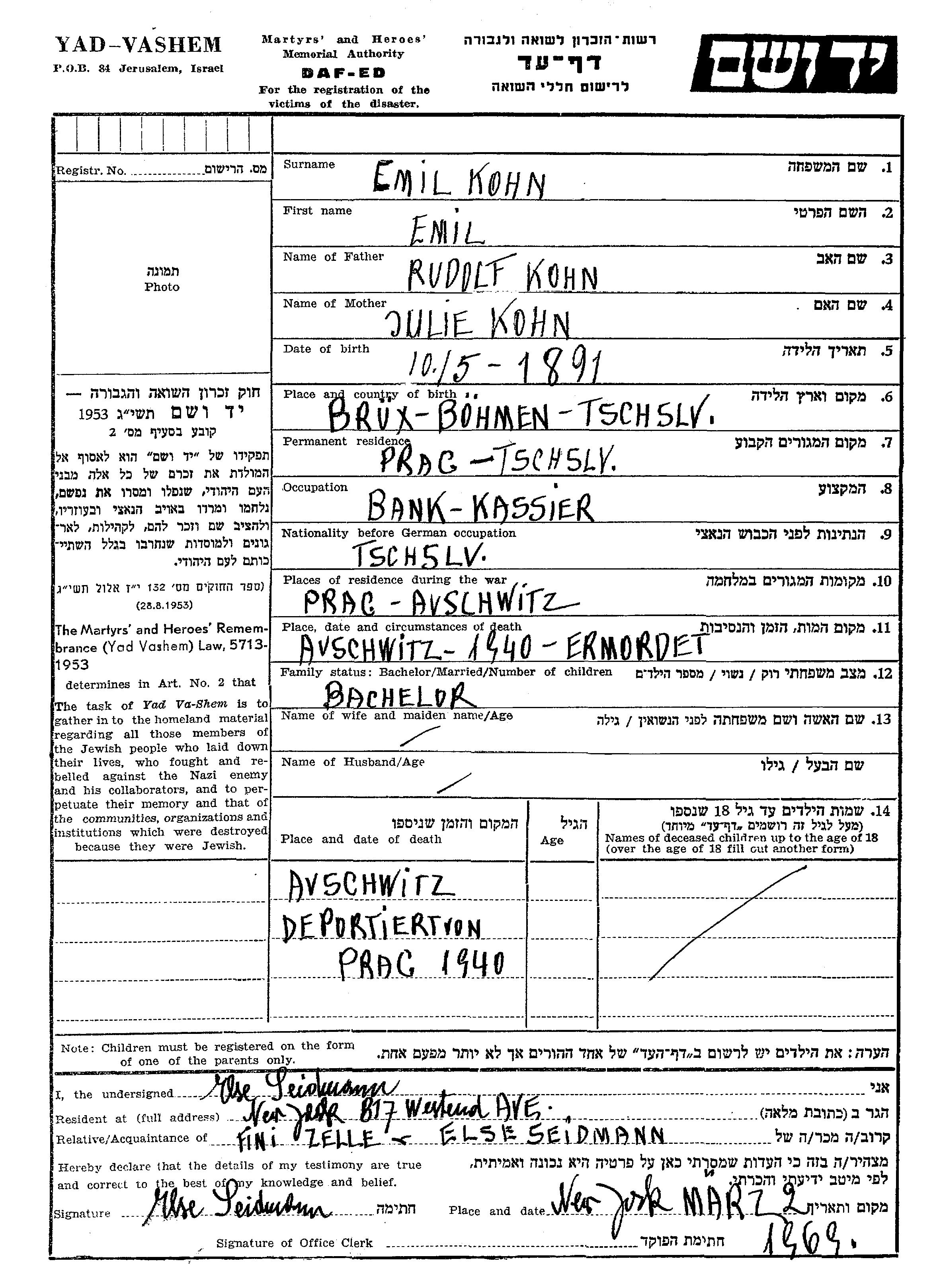 אמיל Kohn נולד בBrux שבצ'כוסלובקיה בשנת 1891 לרודולף וJulie. הוא היה Kassier ורווק. לפני מלחמת העולם השניה התגורר בPrague שבצ'כוסלובקיה. בזמן המלחמה הוא היה בAuschwitz שבפולין. אמיל נרצח בשואה. מקום המוות: Auschwitz שבפולין בשנת 1940.