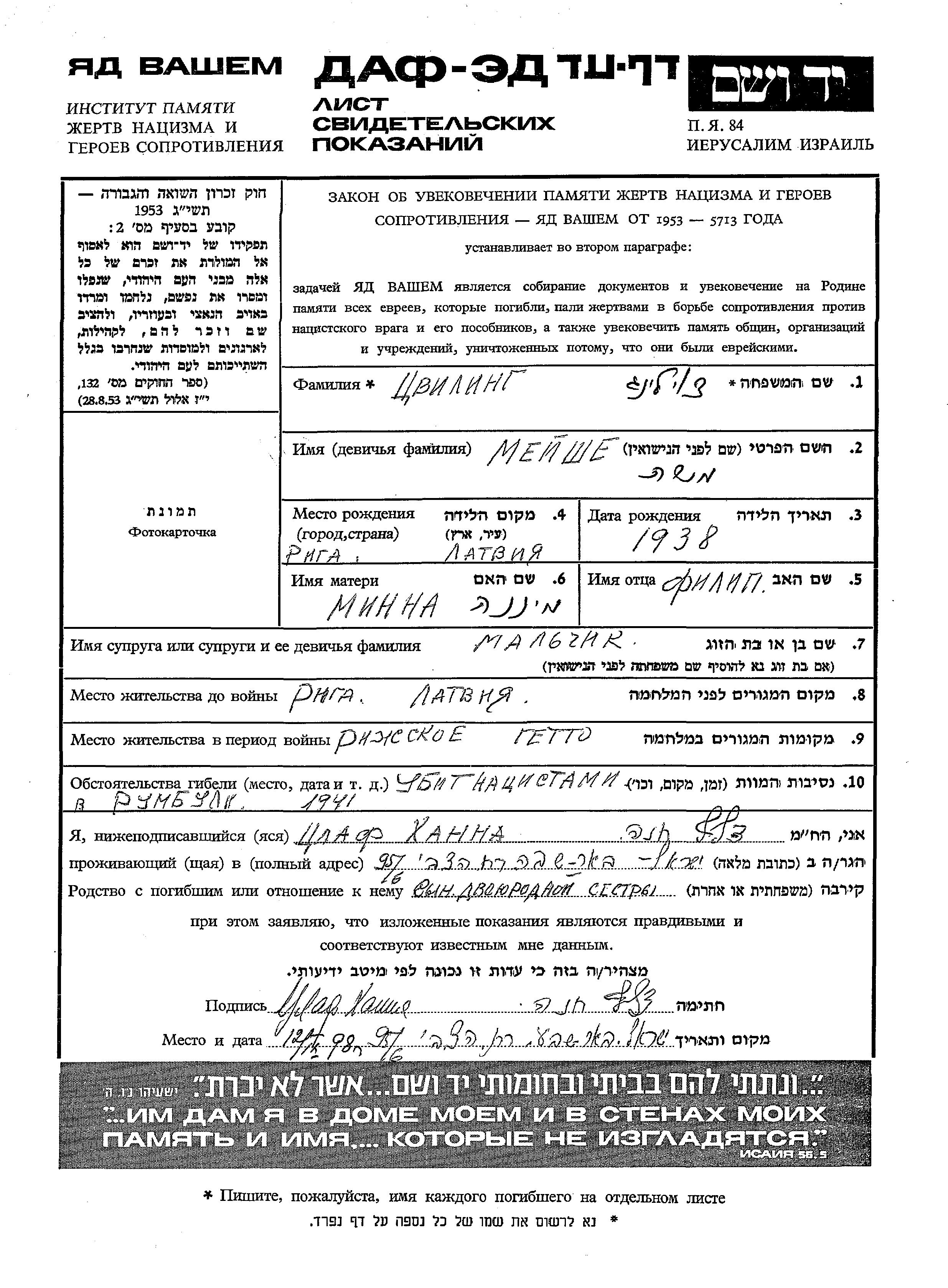 Meishe צוילינג נולד בRiga שבלטביה בשנת 1938 לפיליף וMinna. הוא היה ילד. לפני מלחמת העולם השניה התגורר בRiga שבלטביה. בזמן המלחמה הוא היה בRiga שבלטביה.