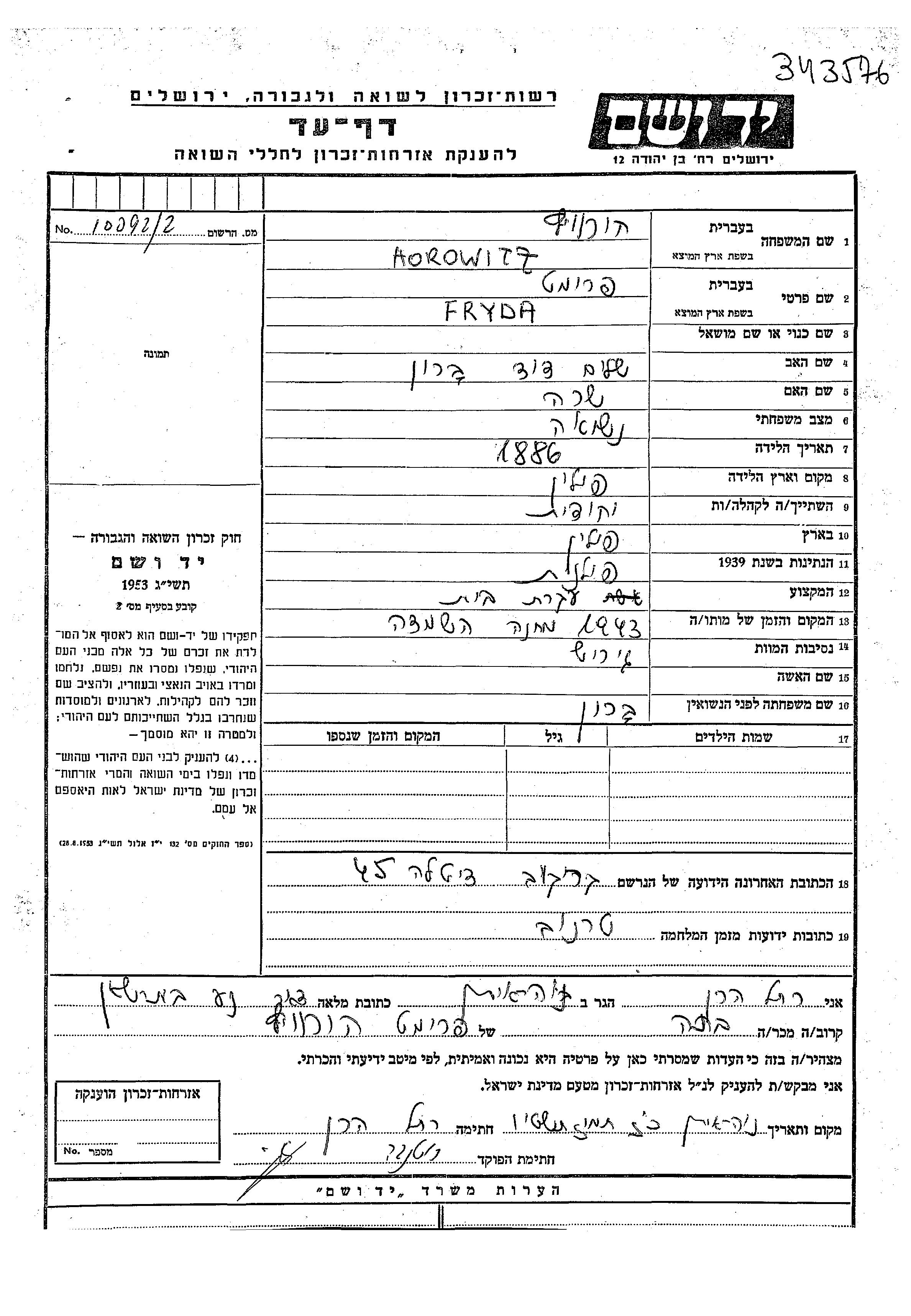 Fryda פרומט Horowitz לבית ברון נולדה בפולין בשנת 1886 לשלום דוד ושרה. היא היתה עקרת בית ונשואה. לפני מלחמת העולם השניה התגוררה בפולין. בזמן המלחמה היא היתה בTarnow שבפולין.