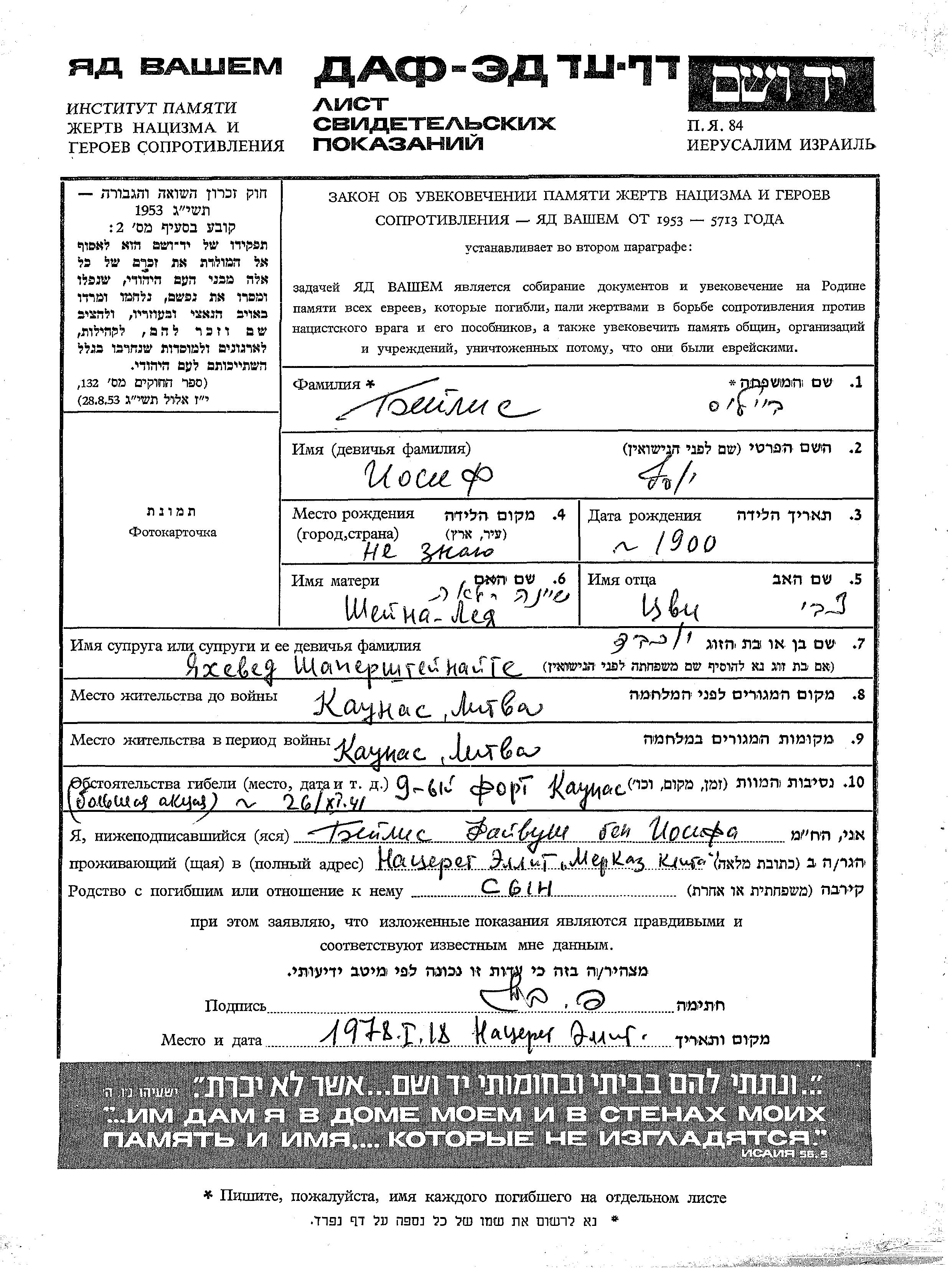 Iosif בייליס נולד בשנת 1900 לצבי וLeya שיינה. הוא היה נשוי לYakheved לבית שפרשטיין. לפני מלחמת העולם השניה התגורר בKaunas שבליטא. בזמן המלחמה הוא היה בKaunas שבליטא. הוא נרצח בשואה. מקום המוות: Kaunas שבליטא בשנת 26/11/1941.
