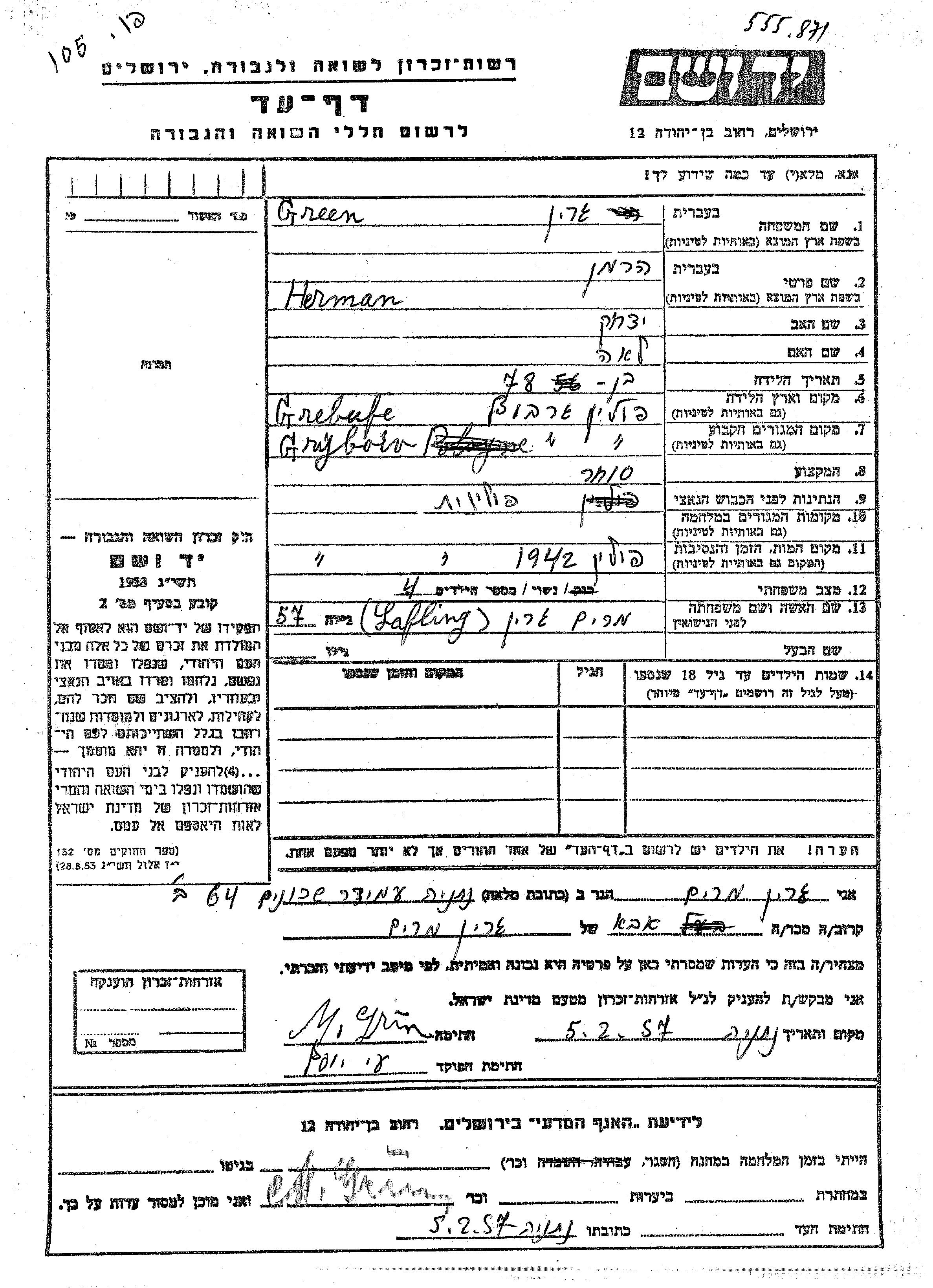 הרמן נרצח בשואה. מקום המוות: Grybow שבפולין בשנת 1942.