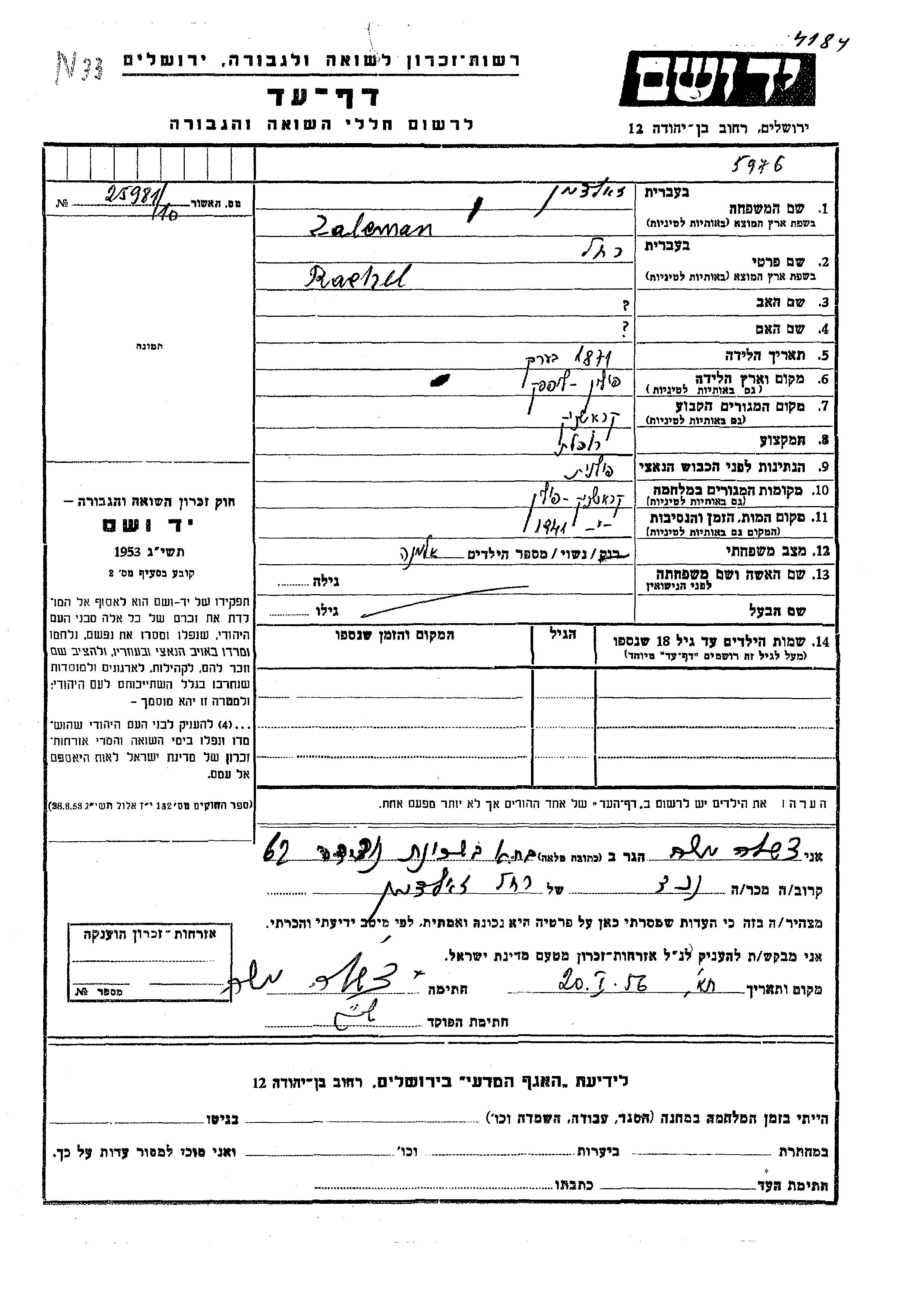 רחל Zalcman נולדה בLipsko שבפולין בשנת 1871. היא היתה רוכלת ואלמנה. לפני מלחמת העולם השניה התגוררה בKraśnik שבפולין. בזמן המלחמה היא היתה בKraśnik שבפולין. רחל נרצחה בשואה. מקום המוות: Kraśnik שבפולין בשנת 1941.