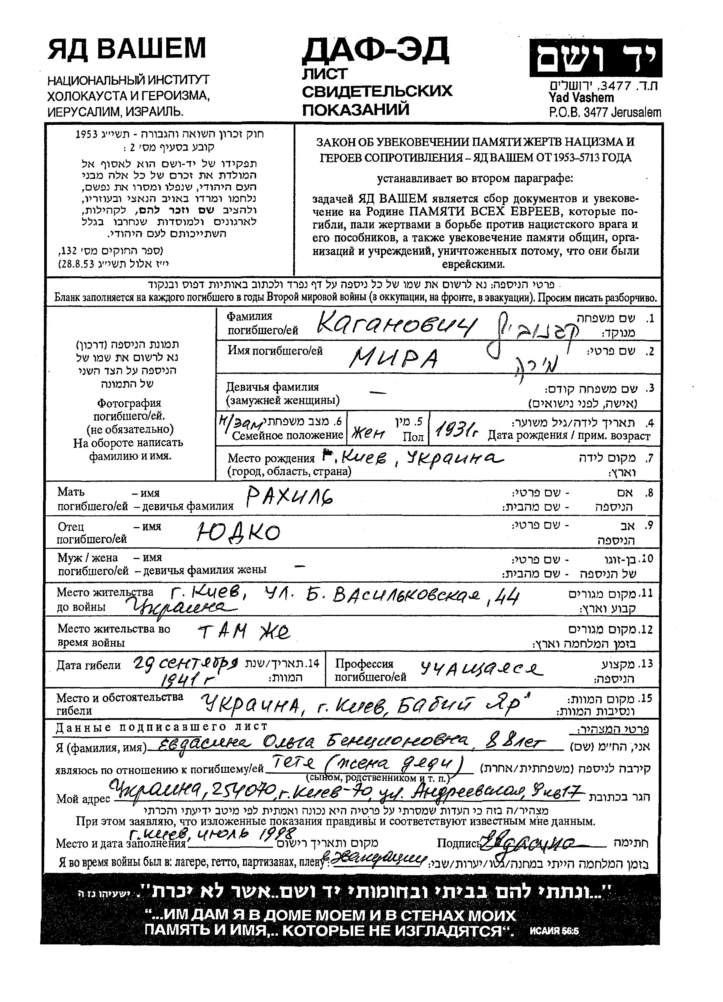מירה נרצחה בשואה. מקום המוות: Babi Yar שבאוקראינה (ברה"מ) בשנת 29/09/1941.
