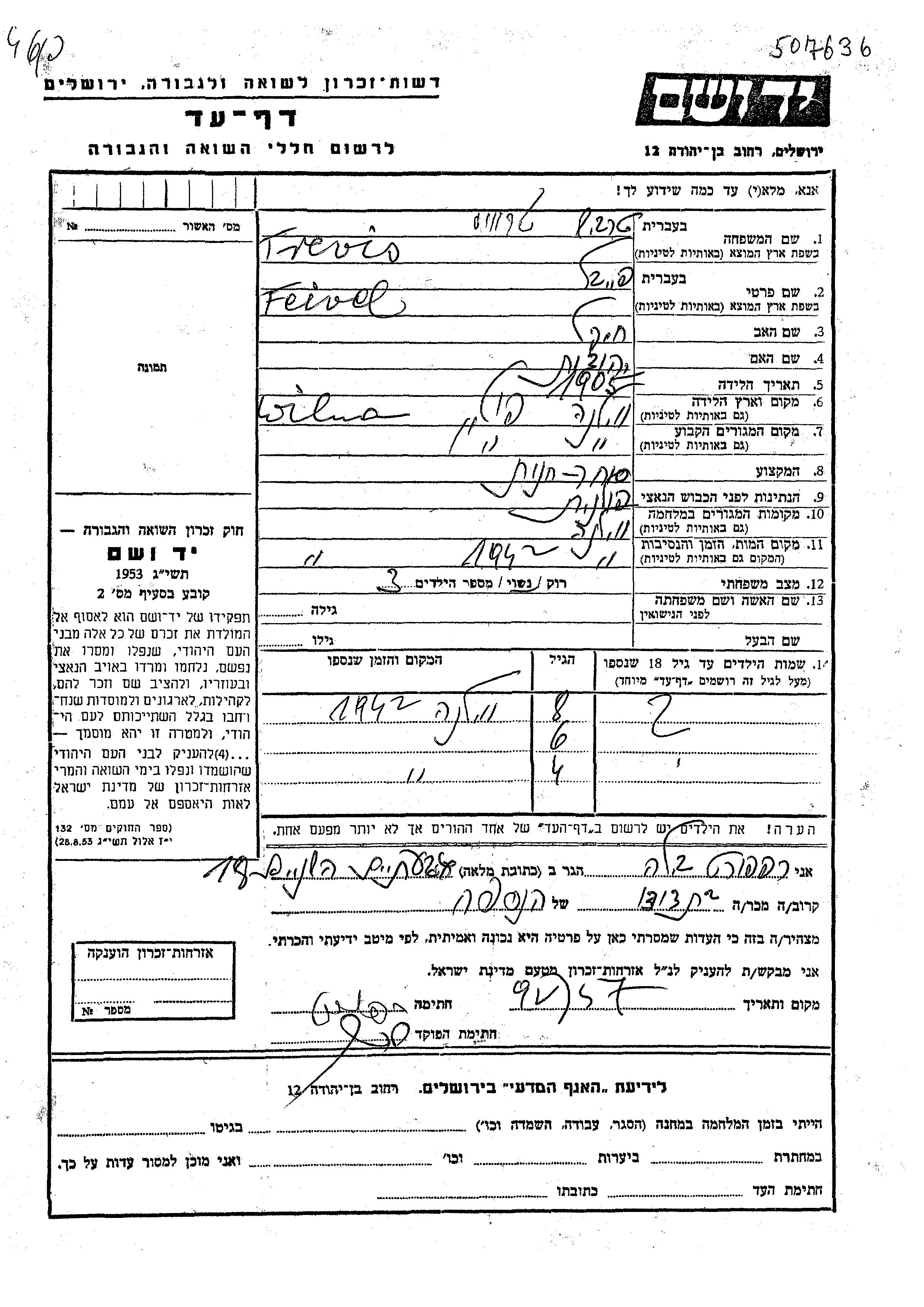 שם פרטי לא ידוע טרוויס נולד/ה לפייוול. הוא/היא היה/היתה ילד/ילדה. לפני מלחמת העולם השניה התגורר/התגוררה בWilno שבפולין. בזמן המלחמה הוא/היא היה/היתה בWilno שבפולין. נרצח/ה בשואה.