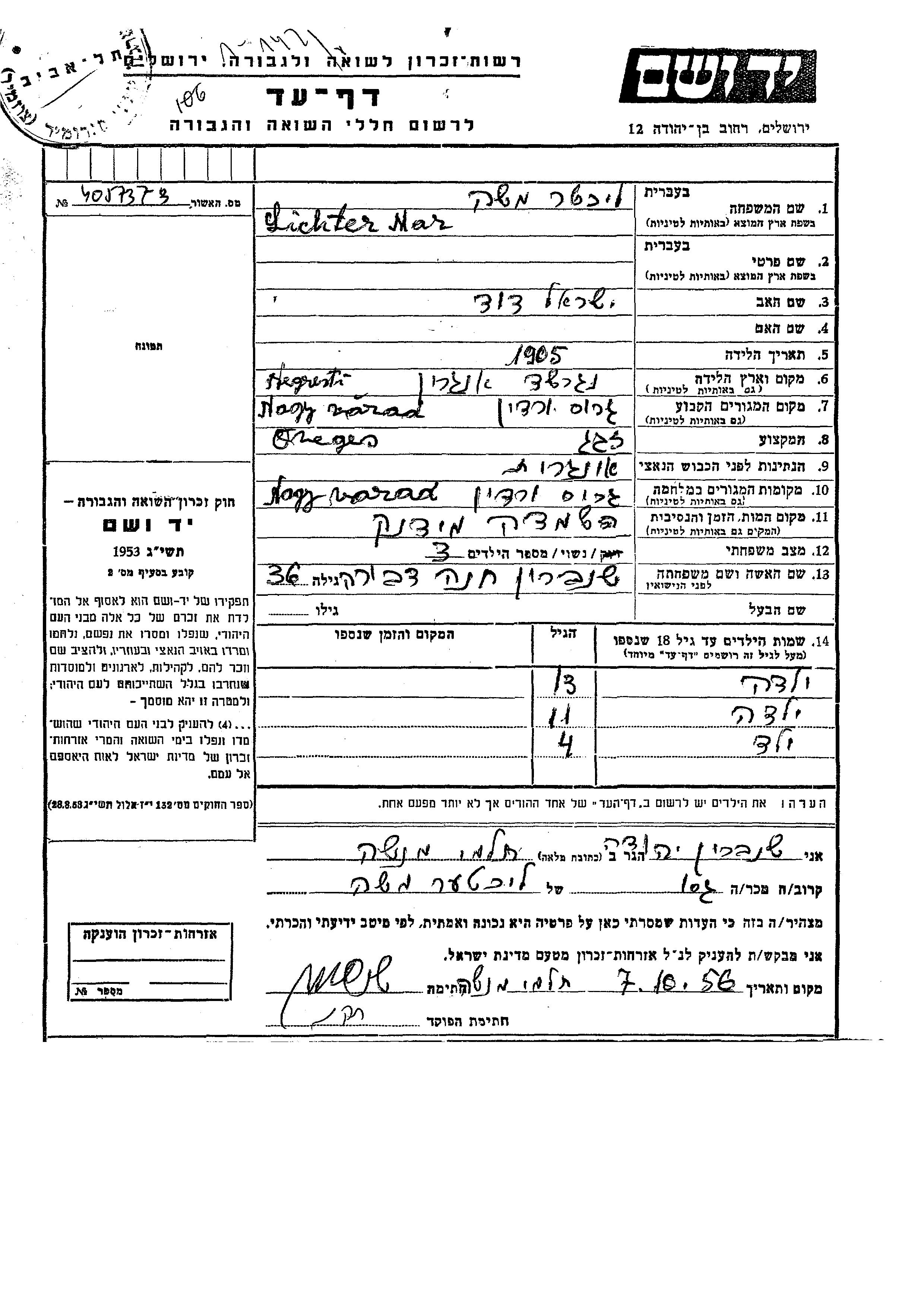 שם פרטי לא ידוע Lichter נולד/ה למשה וחנה דבורה לבית שנברון. הוא/היא היה/היתה ילד/ילדה. לפני מלחמת העולם השניה התגורר/התגוררה בNagy Varad שברומניה. בזמן המלחמה הוא/היא היה/היתה בNagy Varad שברומניה.