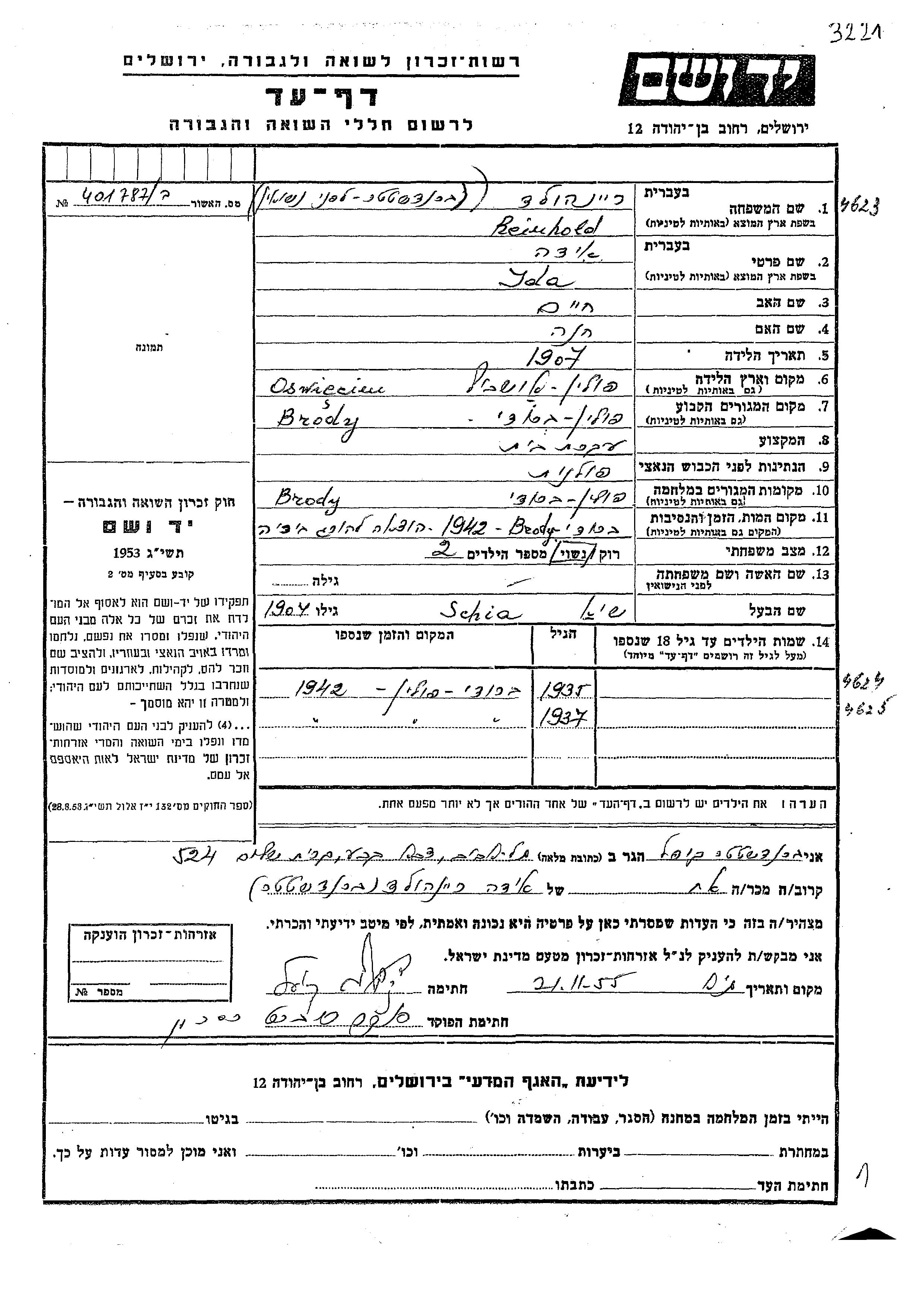 שם פרטי לא ידוע ריינהולד נולד/ה לSchia וYda לבית ברנדשטטר. הוא/היא היה/היתה ילד/ילדה. לפני מלחמת העולם השניה התגורר/התגוררה בBrody שבפולין. בזמן המלחמה הוא/היא היה/היתה בBrody שבפולין. נרצח/ה בשואה.