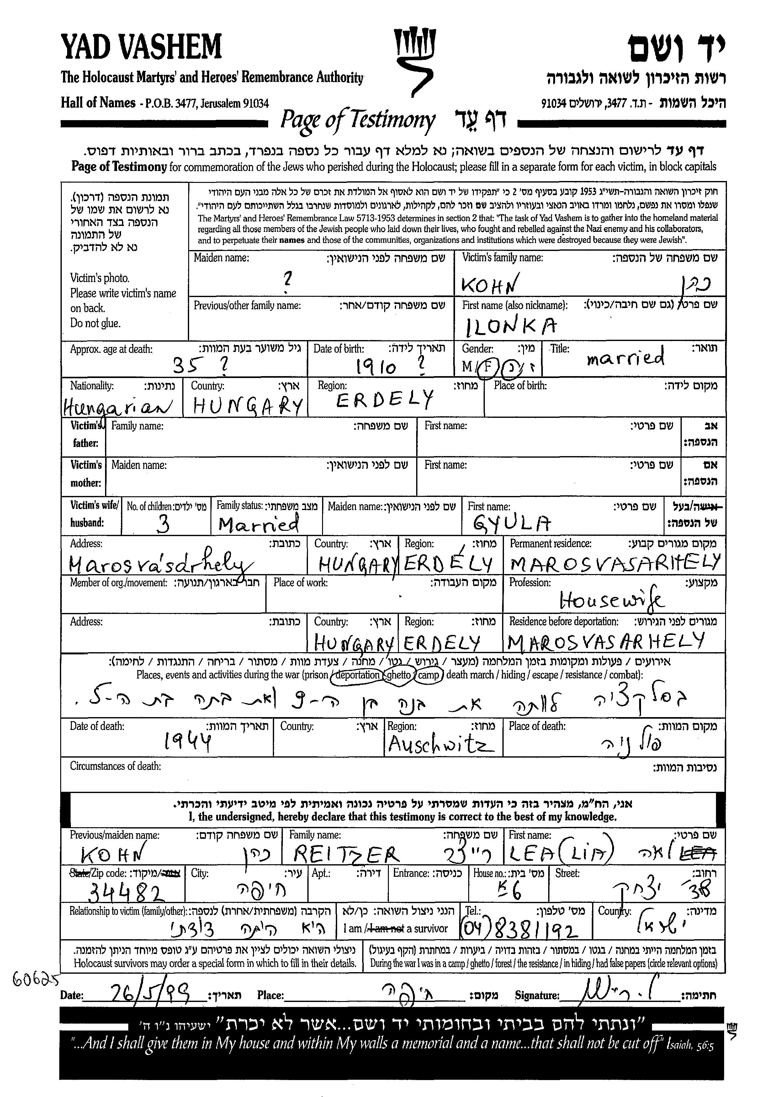 שם פרטי לא ידוע Kohn נולד/ה לGyula וIlonka. הוא/היא היה/היתה ילד/ילדה. לפני מלחמת העולם השניה התגורר/התגוררה בMarosvasarhely שברומניה. בזמן המלחמה הוא/היא היה/היתה בMarosvasarhely שברומניה. נרצח/ה בשואה.