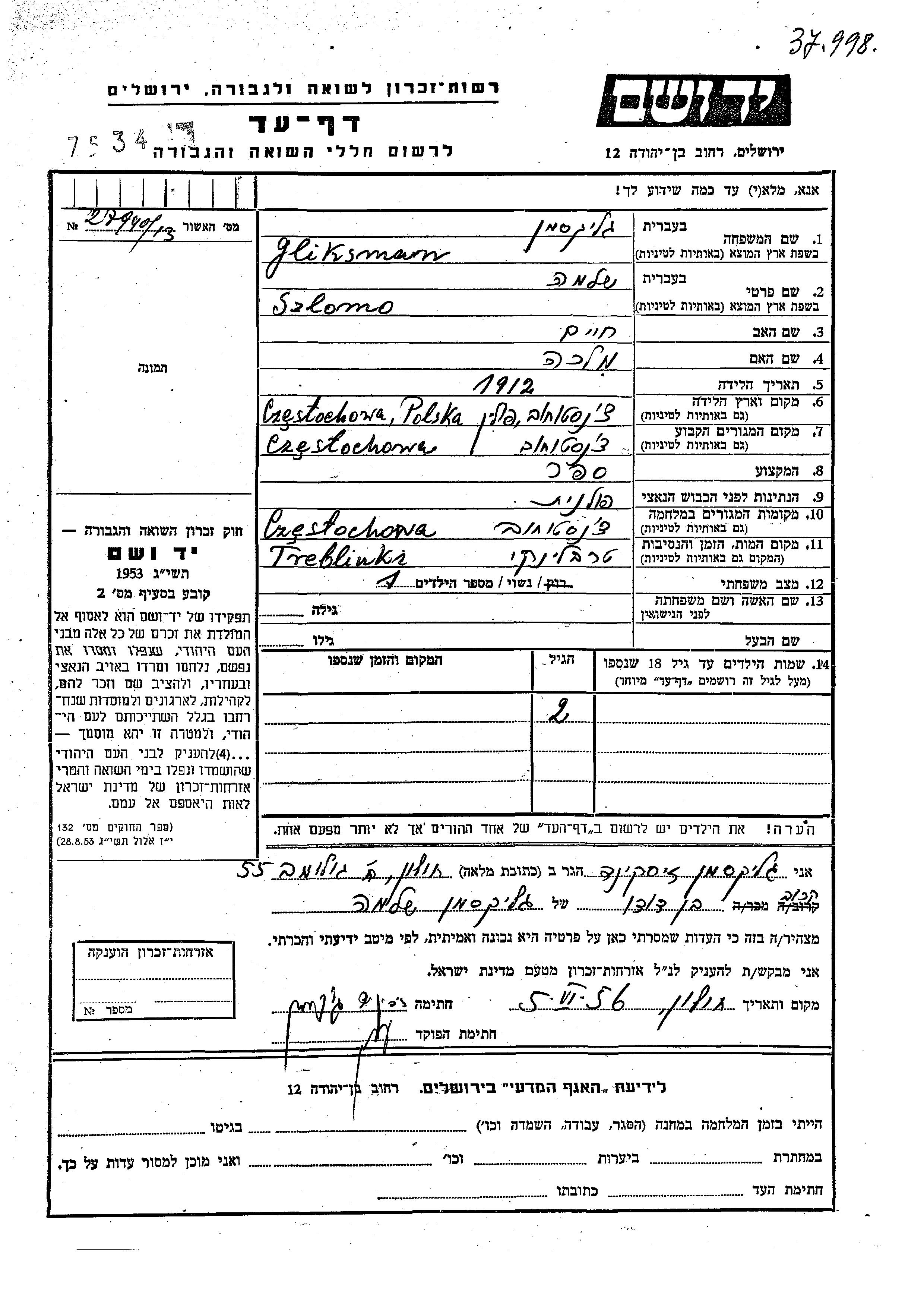 שם פרטי לא ידוע Gliksmann נולד/ה לSzlomo. הוא/היא היה/היתה ילד/ילדה. לפני מלחמת העולם השניה התגורר/התגוררה בCzestochowa שבפולין. בזמן המלחמה הוא/היא היה/היתה בCzestochowa שבפולין. נרצח/ה בשואה.